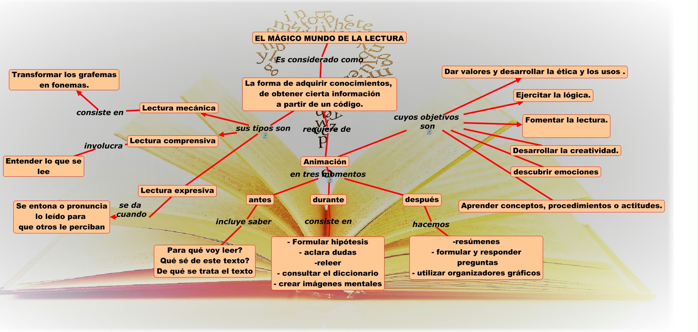 Este Cmap, tiene información relacionada con: EL MÁGICO MUNDO DE LA LECTURA, Lectura expresiva se da cuando Se entona o pronuncia lo leído para que otros le perciban, Animación en tres momentos durante, Animación cuyos objetivos son Desarrollar la creatividad., Animación cuyos objetivos son Aprender conceptos, procedimientos o actitudes., La forma de adquirir conocimientos, de obtener cierta información a partir de un código. sus tipos son Lectura mecánica, La forma de adquirir conocimientos, de obtener cierta información a partir de un código. requiere de Animación, La forma de adquirir conocimientos, de obtener cierta información a partir de un código. sus tipos son Lectura comprensiva, Lectura comprensiva involucra Entender lo que se lee, Animación cuyos objetivos son descubrir emociones, antes incluye saber Para qué voy leer? Qué sé de este texto? De qué se trata el texto, después hacemos -resúmenes - formular y responder preguntas - utilizar organizadores gráficos, La forma de adquirir conocimientos, de obtener cierta información a partir de un código. sus tipos son Lectura expresiva, durante consiste en - Formular hipótesis - aclara dudas -releer - consultar el diccionario - crear imágenes mentales, EL MÁGICO MUNDO DE LA LECTURA Es considerado como La forma de adquirir conocimientos, de obtener cierta información a partir de un código., Lectura mecánica consiste en Transformar los grafemas en fonemas., Animación cuyos objetivos son Ejercitar la lógica., Animación cuyos objetivos son Fomentar la lectura., Animación cuyos objetivos son Dar valores y desarrollar la ética y los usos ., Animación en tres momentos antes, Animación en tres momentos después