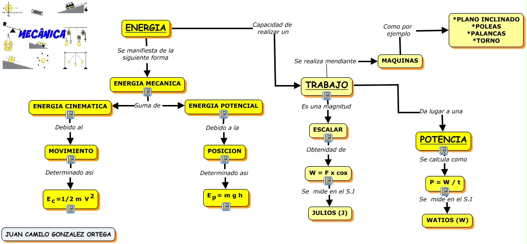 Este Cmap, tiene información relacionada con: MAPA CONCEPTUAL ENERGIA - TRABAJO - POTENCIA CAMILO GONZALEZ, ESCALAR Obtenidad de W = F x cos, POTENCIA Se calcula como P = W / t, W = F x cos Se mide en el S.I JULIOS (J), ENERGIA POTENCIAL Debido a la POSICION, ENERGIA MECANICA Suma de ENERGIA POTENCIAL, TRABAJO Es una magnitud ESCALAR, MAQUINAS Como por ejemplo *PLANO INCLINADO *POLEAS *PALANCAS *TORNO, P = W / t Se mide en el S.I WATIOS (W), ENERGIA Se manifiesta de la siguiente forma ENERGIA MECANICA, MOVIMIENTO Determinado asi <math xmlns="http://www.w3.org/1998/Math/MathML"> <mrow> <mmultiscripts> <mtext> E </mtext> <mtext> c </mtext> <none/> </mmultiscripts> <mtext> =1/2 m </mtext> <mmultiscripts> <mtext> V </mtext> <none/> <mtext> 2 </mtext> </mmultiscripts> </mrow> </math>, TRABAJO Se realiza mendiante MAQUINAS, TRABAJO Da lugar a una POTENCIA, POSICION Determinado asi <math xmlns="http://www.w3.org/1998/Math/MathML"> <mrow> <mmultiscripts> <mtext> E </mtext> <mtext> p </mtext> <none/> </mmultiscripts> <mtext> = m g h </mtext> </mrow> </math>, ENERGIA CINEMATICA Debido al MOVIMIENTO, ENERGIA MECANICA Suma de ENERGIA CINEMATICA, ENERGIA Capacidad de realizar un TRABAJO