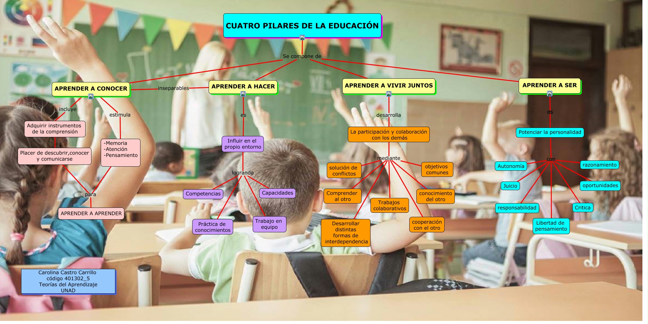 Este Cmap, tiene información relacionada con: Cuatro pilares de la educación, La participación y colaboración con los demás mediante Trabajos colaborativos, Influir en el propio entorno logrando Trabajo en equipo, Potenciar la personalidad con razonamiento, Placer de descubrir,conocer y comunicarse para APRENDER A APRENDER, Potenciar la personalidad con oportunidades, APRENDER A HACER inseparables ????, La participación y colaboración con los demás mediante conocimiento del otro, Potenciar la personalidad con Juicio, La participación y colaboración con los demás mediante objetivos comunes, CUATRO PILARES DE LA EDUCACIÓN Se compone de APRENDER A CONOCER, Adquirir instrumentos de la comprensión ???? Placer de descubrir,conocer y comunicarse, APRENDER A CONOCER incluye Adquirir instrumentos de la comprensión, Potenciar la personalidad con Critica, Adquirir instrumentos de la comprensión ???? ????, Potenciar la personalidad con responsabilidad, APRENDER A HACER es Influir en el propio entorno, La participación y colaboración con los demás mediante solución de conflictos, -Memoria -Atención -Pensamiento para APRENDER A APRENDER, CUATRO PILARES DE LA EDUCACIÓN Se compone de APRENDER A VIVIR JUNTOS, Potenciar la personalidad con Autonomía