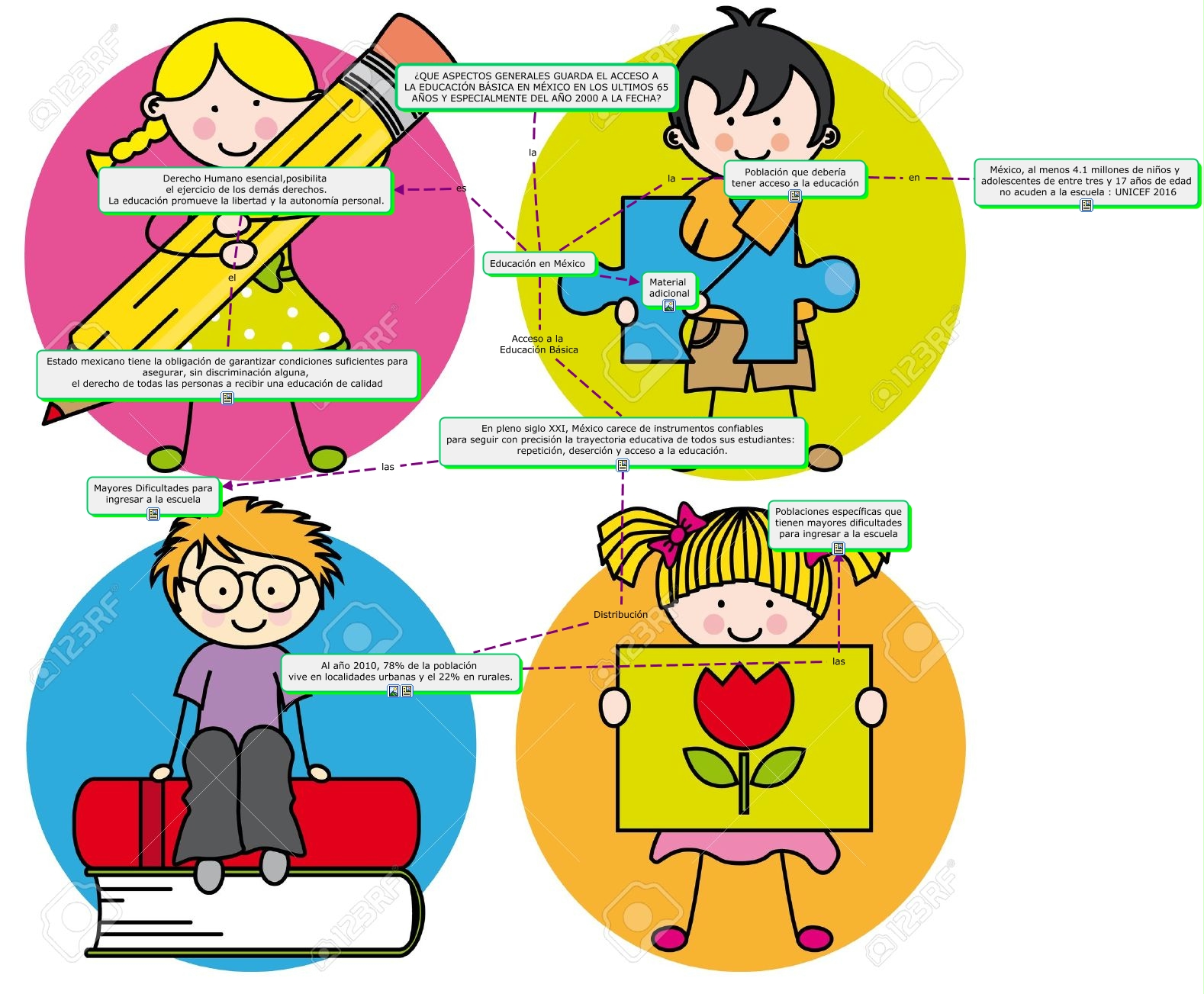 Este Cmap, tiene información relacionada con: Aspectos Generales de la Educación Básica, Educación en México Acceso a la Educación Básica En pleno siglo XXI, México carece de instrumentos confiables para seguir con precisión la trayectoria educativa de todos sus estudiantes: repetición, deserción y acceso a la educación., Educación en México ???? Material adicional, Población que debería tener acceso a la educación en México, al menos 4.1 millones de niños y adolescentes de entre tres y 17 años de edad no acuden a la escuela : UNICEF 2016, ¿QUE ASPECTOS GENERALES GUARDA EL ACCESO A LA EDUCACIÓN BÁSICA EN MÉXICO EN LOS ULTIMOS 65 AÑOS Y ESPECIALMENTE DEL AÑO 2000 A LA FECHA? la Educación en México, Al año 2010, 78% de la población vive en localidades urbanas y el 22% en rurales. las Poblaciones específicas que tienen mayores dificultades para ingresar a la escuela, En pleno siglo XXI, México carece de instrumentos confiables para seguir con precisión la trayectoria educativa de todos sus estudiantes: repetición, deserción y acceso a la educación. Distribución Al año 2010, 78% de la población vive en localidades urbanas y el 22% en rurales., En pleno siglo XXI, México carece de instrumentos confiables para seguir con precisión la trayectoria educativa de todos sus estudiantes: repetición, deserción y acceso a la educación. las Mayores Dificultades para ingresar a la escuela, Educación en México es Derecho Humano esencial,posibilita el ejercicio de los demás derechos. La educación promueve la libertad y la autonomía personal., Educación en México la Población que debería tener acceso a la educación, Derecho Humano esencial,posibilita el ejercicio de los demás derechos. La educación promueve la libertad y la autonomía personal. el Estado mexicano tiene la obligación de garantizar condiciones suficientes para asegurar, sin discriminación alguna, el derecho de todas las personas a recibir una educación de calidad