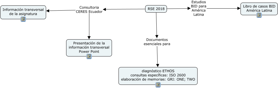 Este Cmap, tiene información relacionada con: Todo sobre RSE 2018, RSE 2018 Consultoria CERES Ecuador Presentación de la información transversal Power Point, RSE 2018 Estudios BID para América Latina Libro de casos BID América Latina, RSE 2018 Consultoria CERES Ecuador Información transversal de la asignatura, RSE 2018 Documentos esenciales para diagnóstico ETHOS consultas específicas: ISO 2600 elaboración de memorias: GRI: ONE; TWO