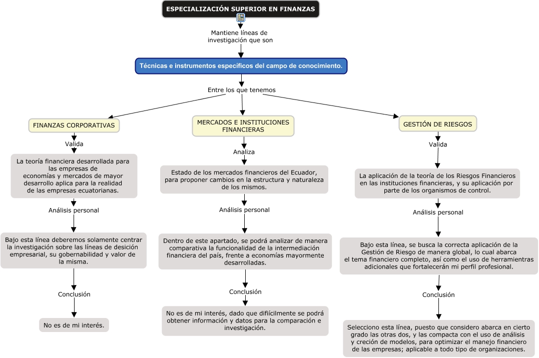 Este Cmap, tiene información relacionada con: Líneas de Investigación, Dentro de este apartado, se podrá analizar de manera comparativa la funcionalidad de la intermediación financiera del país, frente a economías mayormente desarrolladas. Conclusión No es de mi interés, dado que difiícilmente se podrá obtener información y datos para la comparación e investigación., MERCADOS E INSTITUCIONES FINANCIERAS Analiza Estado de los mercados financieros del Ecuador, para proponer cambios en la estructura y naturaleza de los mismos., La aplicación de la teoría de los Riesgos Financieros en las instituciones financieras, y su aplicación por parte de los organismos de control. Análisis personal Bajo esta línea, se busca la correcta aplicación de la Gestión de Riesgo de manera global, lo cual abarca el tema financiero completo, así como el uso de herramientras adicionales que fortalecerán mi perfil profesional., FINANZAS CORPORATIVAS Valida La teoría financiera desarrollada para las empresas de economías y mercados de mayor desarrollo aplica para la realidad de las empresas ecuatorianas., GESTIÓN DE RIESGOS Valida La aplicación de la teoría de los Riesgos Financieros en las instituciones financieras, y su aplicación por parte de los organismos de control., Estado de los mercados financieros del Ecuador, para proponer cambios en la estructura y naturaleza de los mismos. Análisis personal Dentro de este apartado, se podrá analizar de manera comparativa la funcionalidad de la intermediación financiera del país, frente a economías mayormente desarrolladas., Técnicas e instrumentos específicos del campo de conocimiento. Entre los que tenemos FINANZAS CORPORATIVAS, Bajo esta línea, se busca la correcta aplicación de la Gestión de Riesgo de manera global, lo cual abarca el tema financiero completo, así como el uso de herramientras adicionales que fortalecerán mi perfil profesional. Conclusión Selecciono esta línea, puesto que considero abarca en cierto grado las otras dos, y las compacta con el uso de análisis y creción de modelos, para optimizar el manejo financiero de las empresas; aplicable a todo tipo de organizaciones., ESPECIALIZACIÓN SUPERIOR EN FINANZAS Mantiene líneas de investigación que son Técnicas e instrumentos específicos del campo de conocimiento., ESPECIALIZACIÓN SUPERIOR EN FINANZAS Mantiene líneas de investigación que son Técnicas e instrumentos específicos del campo de conocimiento., Técnicas e instrumentos específicos del campo de conocimiento. Entre los que tenemos MERCADOS E INSTITUCIONES FINANCIERAS, Bajo esta línea deberemos solamente centrar la investigación sobre las líneas de desición empresarial, su gobernabilidad y valor de la misma. Conclusión No es de mi interés., Técnicas e instrumentos específicos del campo de conocimiento. Entre los que tenemos GESTIÓN DE RIESGOS, La teoría financiera desarrollada para las empresas de economías y mercados de mayor desarrollo aplica para la realidad de las empresas ecuatorianas. Análisis personal Bajo esta línea deberemos solamente centrar la investigación sobre las líneas de desición empresarial, su gobernabilidad y valor de la misma.
