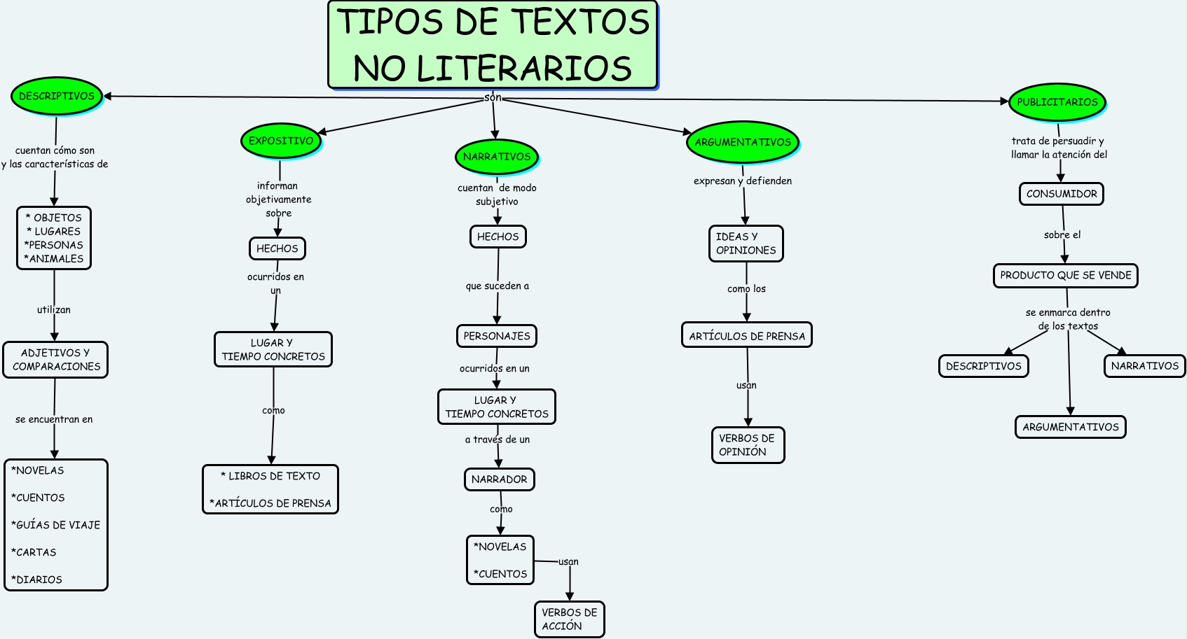 Este Cmap, tiene información relacionada con: TEXTOS NO LITARARIOS, ADJETIVOS Y COMPARACIONES se encuentran en *NOVELAS *CUENTOS *GU�?AS DE VIAJE *CARTAS *DIARIOS, TIPOS DE TEXTOS NO LITERARIOS son PUBLICITARIOS, CONSUMIDOR sobre el PRODUCTO QUE SE VENDE, IDEAS Y OPINIONES como los ART�?CULOS DE PRENSA, TIPOS DE TEXTOS NO LITERARIOS son ARGUMENTATIVOS, LUGAR Y TIEMPO CONCRETOS a través de un NARRADOR, ARGUMENTATIVOS expresan y defienden IDEAS Y OPINIONES, EXPOSITIVO informan objetivamente sobre HECHOS, PRODUCTO QUE SE VENDE se enmarca dentro de los textos ARGUMENTATIVOS, PRODUCTO QUE SE VENDE se enmarca dentro de los textos DESCRIPTIVOS, NARRATIVOS cuentan de modo subjetivo HECHOS, TIPOS DE TEXTOS NO LITERARIOS son DESCRIPTIVOS, *NOVELAS *CUENTOS usan VERBOS DE ACCIÓN, HECHOS ocurridos en un LUGAR Y TIEMPO CONCRETOS, DESCRIPTIVOS cuentan cómo son y las características de * OBJETOS * LUGARES *PERSONAS *ANIMALES, NARRADOR como *NOVELAS *CUENTOS, * OBJETOS * LUGARES *PERSONAS *ANIMALES utilizan ADJETIVOS Y COMPARACIONES, LUGAR Y TIEMPO CONCRETOS como * LIBROS DE TEXTO *ART�?CULOS DE PRENSA, HECHOS que suceden a PERSONAJES, PRODUCTO QUE SE VENDE se enmarca dentro de los textos NARRATIVOS