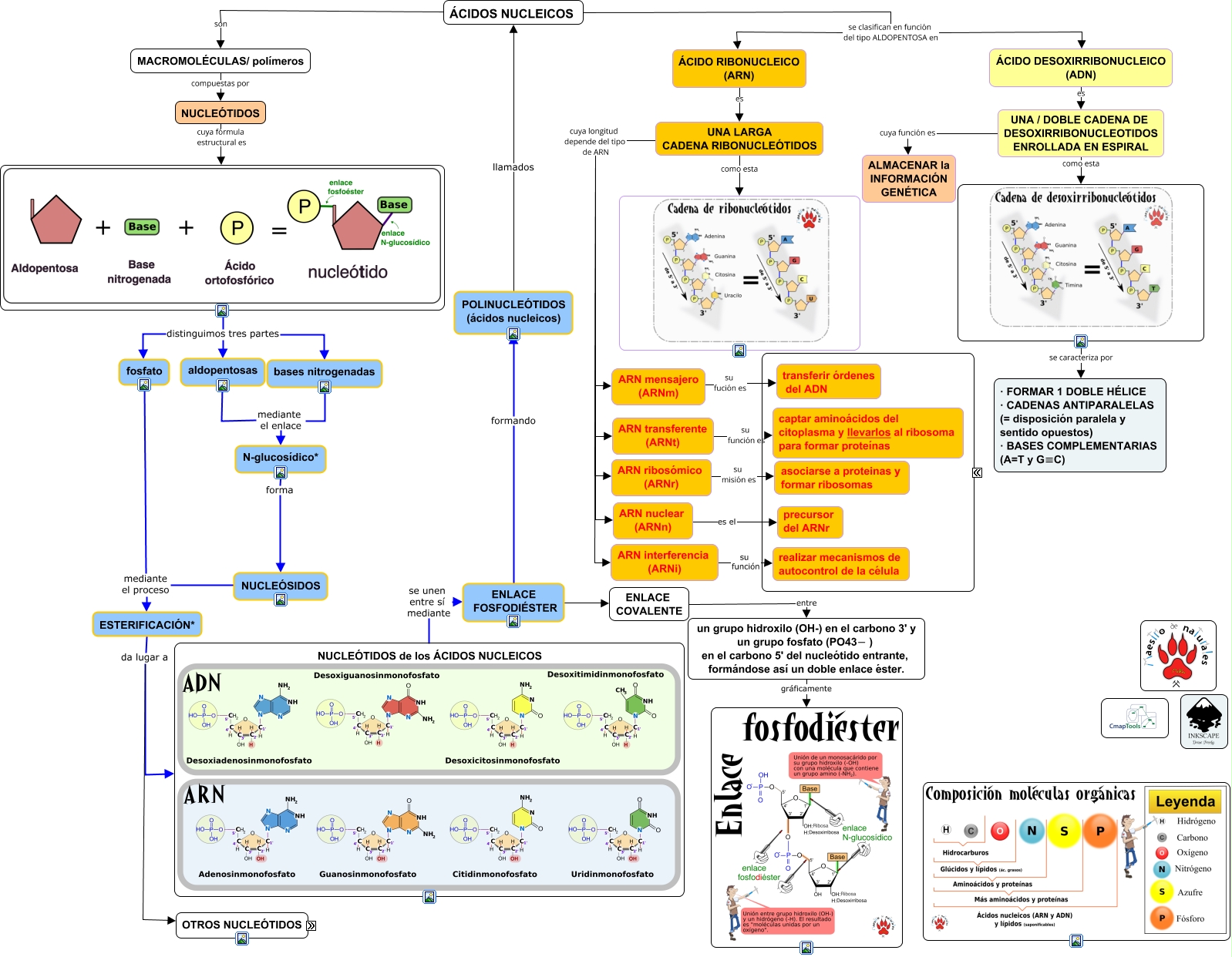 Este Cmap, tiene información relacionada con: Tema 10.07 Biomoléculas orgánicas ácidos nucleicos, ÁCIDOS NUCLEICOS son MACROMOLÉCULAS/ polímeros, ÁCIDO DESOXIRRIBONUCLEICO (ADN) es UNA / DOBLE CADENA DE DESOXIRRIBONUCLEOTIDOS ENROLLADA EN ESPIRAL, UNA LARGA CADENA RIBONUCLEÓTIDOS cuya longitud depende del tipo de ARN ARN nuclear (ARNn), ... que actúan como COENZIMAS e.g NADP, NUCLEÓTIDOS cuya fórmula estructural es, UNA / DOBLE CADENA DE DESOXIRRIBONUCLEOTIDOS ENROLLADA EN ESPIRAL cuya función es ALMACENAR la INFORMACIÓN GENÉTICA, NUCLEÓTIDOS sus funciones metabólicas s .. ... mediadores en procesos hormonales, ... mediadores en procesos hormonales como AMPc, N-glucosídico* forma NUCLEÓSIDOS, ... dadores de energía: como los nucleótidos trifosfatos como ATP ADP AMP, aldopentosas mediante el enlace N-glucosídico*, bases nitrogenadas mediante el enlace N-glucosídico*, POLINUCLEÓTIDOS (ácidos nucleicos) llamados ÁCIDOS NUCLEICOS, ... que actúan como COENZIMAS e.g FAD, ENLACE FOSFODIÉSTER formando POLINUCLEÓTIDOS (ácidos nucleicos), NUCLEÓTIDOS de los ÁCIDOS NUCLEICOS se unen entre sí mediante ENLACE FOSFODIÉSTER, ARN interferencia (ARNi) su función realizar mecanismos de autocontrol de la célula, NUCLEÓTIDOS son NADP, NUCLEÓTIDOS son CoA, ÁCIDOS NUCLEICOS se clasifican en función del tipo ALDOPENTOSA en ÁCIDO RIBONUCLEICO (ARN)