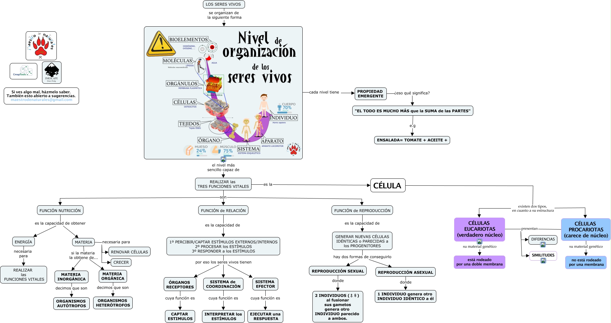 Este Cmap, tiene información relacionada con: Tema 10.01 Funciones vitales y organización estructural de los seres vivos, MATERIA si la materia la obtiene de... MATERIA INORGÁNICA, LOS SERES VIVOS se organizan de la siguiente forma, SISTEMA de COORDINACIÓN cuya función es INTERPRETAR los ESTÍMULOS, REPRODUCCIÓN SEXUAL donde 2 INDIVIDUOS (♂♀) al fusionar sus gametos genera otro INDIVIDUO parecido a ambos., CÉLULAS PROCARIOTAS (carece de núcleo) presentan DIFERENCIAS, REPRODUCCIÓN ASEXUAL donde 1 INDIVIDUO genera otro INDIVIDUO IDÉNTICO a él, cada nivel tiene PROPIEDAD EMERGENTE, 1º PERCIBIR/CAPTAR ESTÍMULOS EXTERNOS/INTERNOS 2º PROCESAR los ESTÍMULOS 3º RESPONDER a los ESTÍMULOS por eso los seres vivos tienen SISTEMA de COORDINACIÓN, ÓRGANOS RECEPTORES cuya función es CAPTAR ESTIMULOS, MATERIA necesaria para RENOVAR CÉLULAS, REALIZAR las TRES FUNCIONES VITALES es la CÉLULA, MATERIA INORGÁNICA decimos que son ORGANISMOS AUTÓTROFOS, CÉLULAS PROCARIOTAS (carece de núcleo) presentan SIMILITUDES, REALIZAR las TRES FUNCIONES VITALES son FUNCIÓN NUTRICIÓN, FUNCIÓN de REPRODUCCIÓN es la capacidad de GENERAR NUEVAS CÉLULAS IDÉNTICAS o PARECIDAS a los PROGENITORES, CÉLULAS PROCARIOTAS (carece de núcleo) su material genético no está rodeado por una membrana, PROPIEDAD EMERGENTE ¿eso qué significa? "EL TODO ES MUCHO MÁS que la SUMA de las PARTES", MATERIA si la materia la obtiene de... MATERIA ORGÁNICA, FUNCIÓN NUTRICIÓN es la capacidad de obtener ENERGÍA, GENERAR NUEVAS CÉLULAS IDÉNTICAS o PARECIDAS a los PROGENITORES hay dos formas de conseguirlo REPRODUCCIÓN SEXUAL