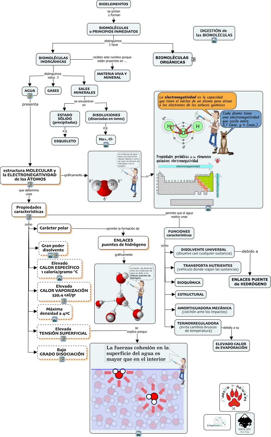 Este Cmap, tiene información relacionada con: Tema 8.03 Biomoléculas inorgánicas, estructura MOLECULAR y la ELECTRONEGATIVIDAD de los ÁTOMOS que determina unas Propiedades características, TERMORREGULADORA (evita cambios bruscos de temperatura) debido a su ELEVADO CALOR de EVAPORACIÓN, FUNCIONES características como TRANSPORTA NUTRIENTES (vehículo donde viajan las sustancias), ESTADO SÓLIDO (precipitadas) e.g ESQUELETO, FUNCIONES características como ESTRUCTURAL, ÁCIDOS NUCLEICOS químicamente son CADENAS de CARBONO (lineales, ramificadas, cíclicas) a las que se les UNE ÁTOMOS de HIDRÓGENO, OXÍGENO, NITRÓGENO, AZUFRE y FÓSFORO, y, BIOMOLÉCULAS o PRINCIPIOS INMEDIATOS distinguimos 2 tipos BIOMOLÉCULAS INORGÁNICAS, BIOELEMENTOS se juntan y forman BIOMOLÉCULAS o PRINCIPIOS INMEDIATOS, Carácter polar permite la formación de ENLACES puentes de hidrógeno, FUNCIONES características como BIOQUÍMICA, BIOMOLÉCULAS ORGÁNICAS distinguimos estos 4 ÁCIDOS NUCLEICOS, estructura MOLECULAR y la ELECTRONEGATIVIDAD de los ÁTOMOS gráficamente, SALES MINERALES se encuentran en ESTADO SÓLIDO (precipitadas), CADENAS de CARBONO (lineales, ramificadas, cíclicas) a las que se les UNE ÁTOMOS de HIDRÓGENO, OXÍGENO, NITRÓGENO, AZUFRE y FÓSFORO gráficamente, BIOMOLÉCULAS INORGÁNICAS distinguimos estos 3 GASES, BIOMOLÉCULAS ORGÁNICAS distinguimos estos 4 GLÚCIDOS, BIOMOLÉCULAS o PRINCIPIOS INMEDIATOS distinguimos 2 tipos BIOMOLÉCULAS ORGÁNICAS, BIOMOLÉCULAS ORGÁNICAS distinguimos estos 4 LÍPIDOS, BIOMOLÉCULAS ORGÁNICAS sólo están en la MATERIA VIVA