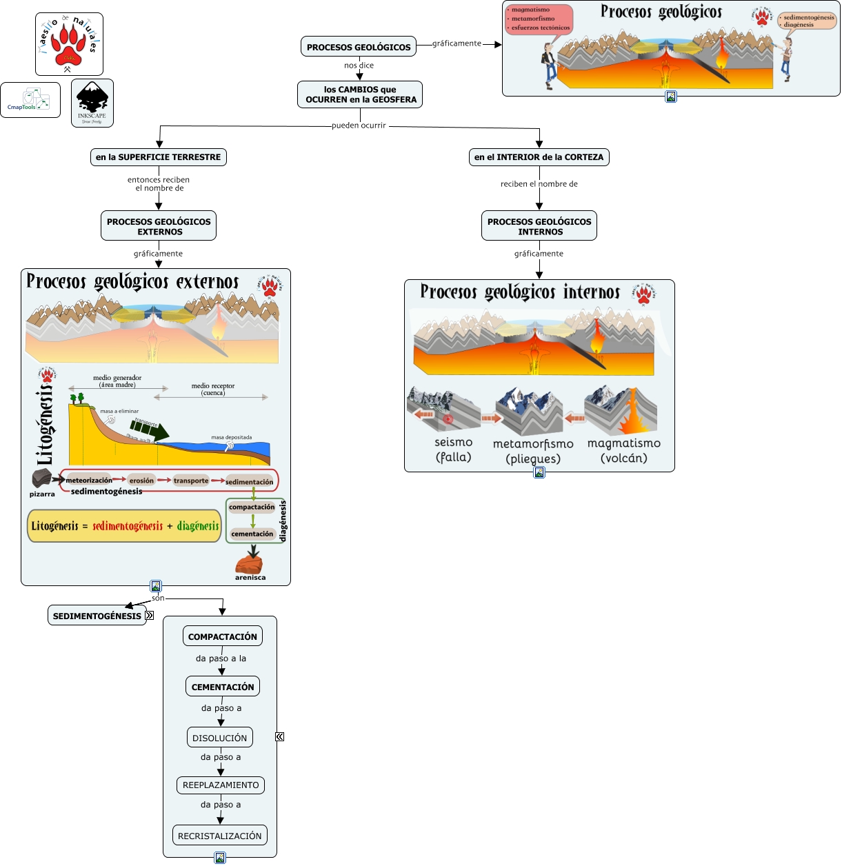 Este Cmap, tiene información relacionada con: 3.3 Procesos geológicos externos, COMPACTACIÓN da paso a la CEMENTACIÓN, son SEDIMENTACIÓN, PROCESOS GEOLÓGICOS INTERNOS gráficamente, PROCESOS GEOLÓGICOS nos dice los CAMBIOS que OCURREN en la GEOSFERA, son EROSIÓN, los CAMBIOS que OCURREN en la GEOSFERA pueden ocurrir en la SUPERFICIE TERRESTRE, son DIAGÉNESIS, CEMENTACIÓN da paso a DISOLUCIÓN, en la SUPERFICIE TERRESTRE entonces reciben el nombre de PROCESOS GEOLÓGICOS EXTERNOS, son TRANSPORTE, son METEORIZACIÓN, DISOLUCIÓN da paso a REEPLAZAMIENTO, REEPLAZAMIENTO da paso a RECRISTALIZACIÓN, los CAMBIOS que OCURREN en la GEOSFERA pueden ocurrir en el INTERIOR de la CORTEZA, en el INTERIOR de la CORTEZA reciben el nombre de PROCESOS GEOLÓGICOS INTERNOS, PROCESOS GEOLÓGICOS EXTERNOS gráficamente, PROCESOS GEOLÓGICOS gráficamente