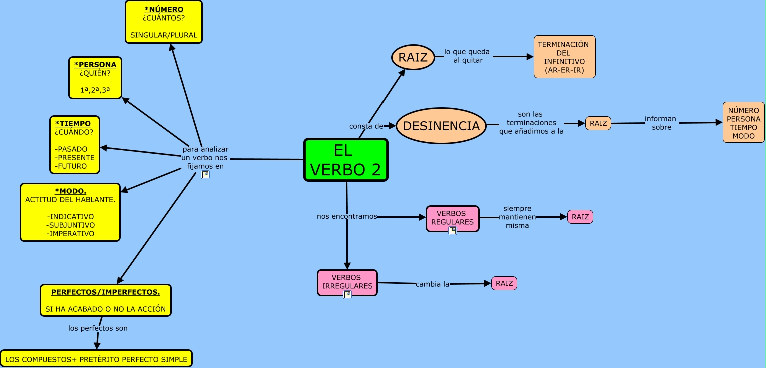 Este Cmap, tiene información relacionada con: verbos 2, EL VERBO 2 para analizar un verbo nos fijamos en *MODO. ACTITUD DEL HABLANTE. -INDICATIVO -SUBJUNTIVO -IMPERATIVO, VERBOS IRREGULARES cambia la RAIZ, RAIZ informan sobre NÚMERO PERSONA TIEMPO MODO, EL VERBO 2 nos encontramos VERBOS IRREGULARES, RAIZ lo que queda al quitar TERMINACIÓN DEL INFINITIVO (AR-ER-IR), VERBOS REGULARES siempre mantienen misma RAIZ, EL VERBO 2 nos encontramos VERBOS REGULARES, EL VERBO 2 para analizar un verbo nos fijamos en *NÚMERO ¿CUÁNTOS? SINGULAR/PLURAL, EL VERBO 2 consta de DESINENCIA, PERFECTOS/IMPERFECTOS. SI HA ACABADO O NO LA ACCIÓN los perfectos son LOS COMPUESTOS+ PRETÉRITO PERFECTO SIMPLE, EL VERBO 2 para analizar un verbo nos fijamos en PERFECTOS/IMPERFECTOS. SI HA ACABADO O NO LA ACCIÓN, EL VERBO 2 para analizar un verbo nos fijamos en *PERSONA ¿QUIÉN? 1ª,2ª,3ª, EL VERBO 2 para analizar un verbo nos fijamos en *TIEMPO ¿CUÁNDO? -PASADO -PRESENTE -FUTURO, DESINENCIA son las terminaciones que añadimos a la RAIZ, EL VERBO 2 consta de RAIZ