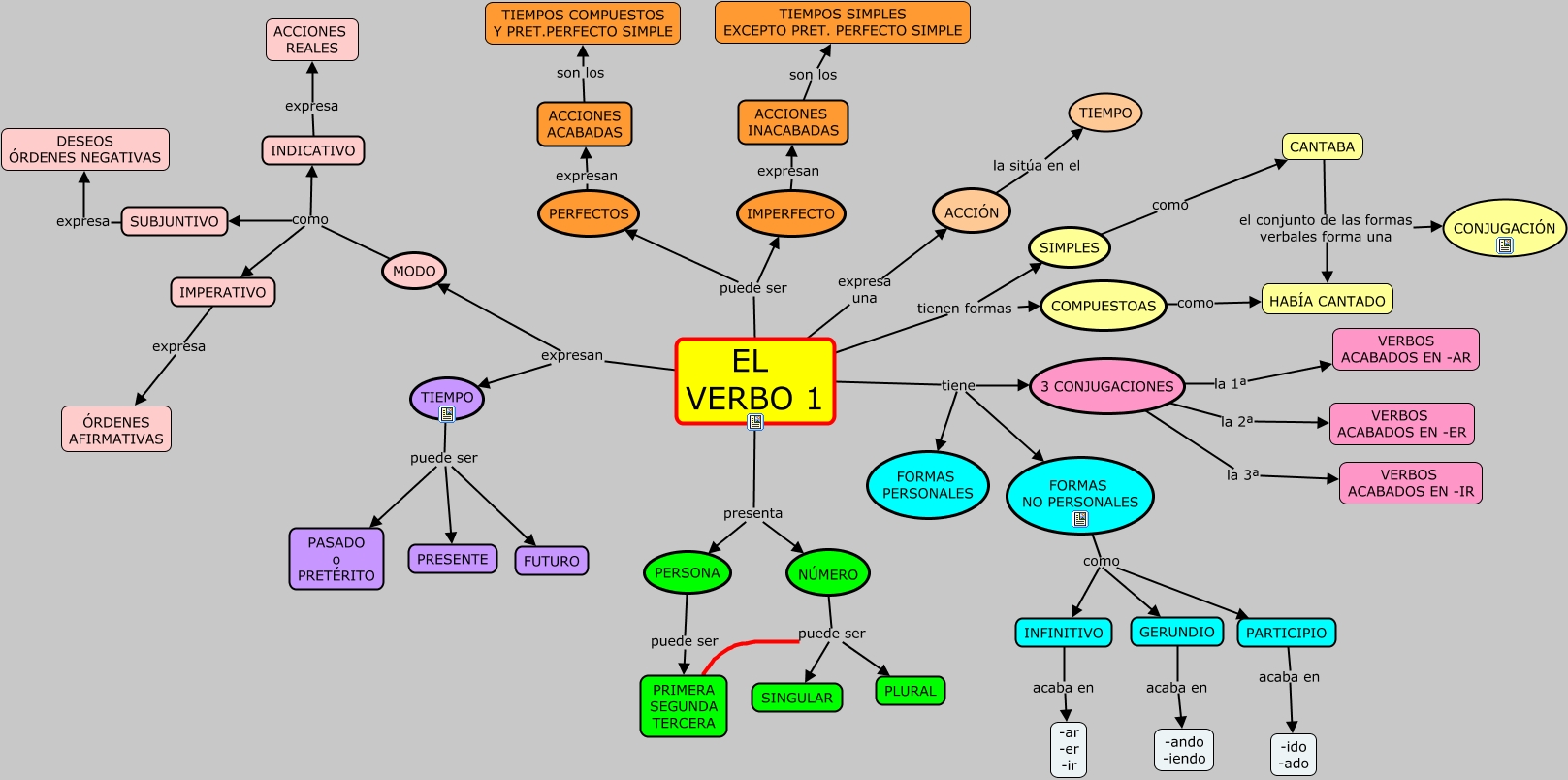 Este Cmap, tiene información relacionada con: VERBO 1, 3 CONJUGACIONES la 3ª VERBOS ACABADOS EN -IR, 3 CONJUGACIONES la 1ª VERBOS ACABADOS EN -AR, TIEMPO puede ser PRESENTE, SUBJUNTIVO expresa DESEOS ÓRDENES NEGATIVAS, TIEMPO puede ser FUTURO, EL VERBO 1 tiene 3 CONJUGACIONES, IMPERFECTO expresan ACCIONES INACABADAS, MODO como SUBJUNTIVO, IMPERATIVO expresa ÓRDENES AFIRMATIVAS, INDICATIVO expresa ACCIONES REALES, ACCIONES ACABADAS son los TIEMPOS COMPUESTOS Y PRET.PERFECTO SIMPLE, EL VERBO 1 tiene FORMAS NO PERSONALES, EL VERBO 1 tiene FORMAS PERSONALES, CANTABA el conjunto de las formas verbales forma una CONJUGACIÓN, INFINITIVO acaba en -ar -er -ir, NÚMERO puede ser SINGULAR, FORMAS NO PERSONALES como INFINITIVO, CANTABA el conjunto de las formas verbales forma una HABÍA CANTADO, EL VERBO 1 presenta NÚMERO, EL VERBO 1 expresa una ACCIÓN