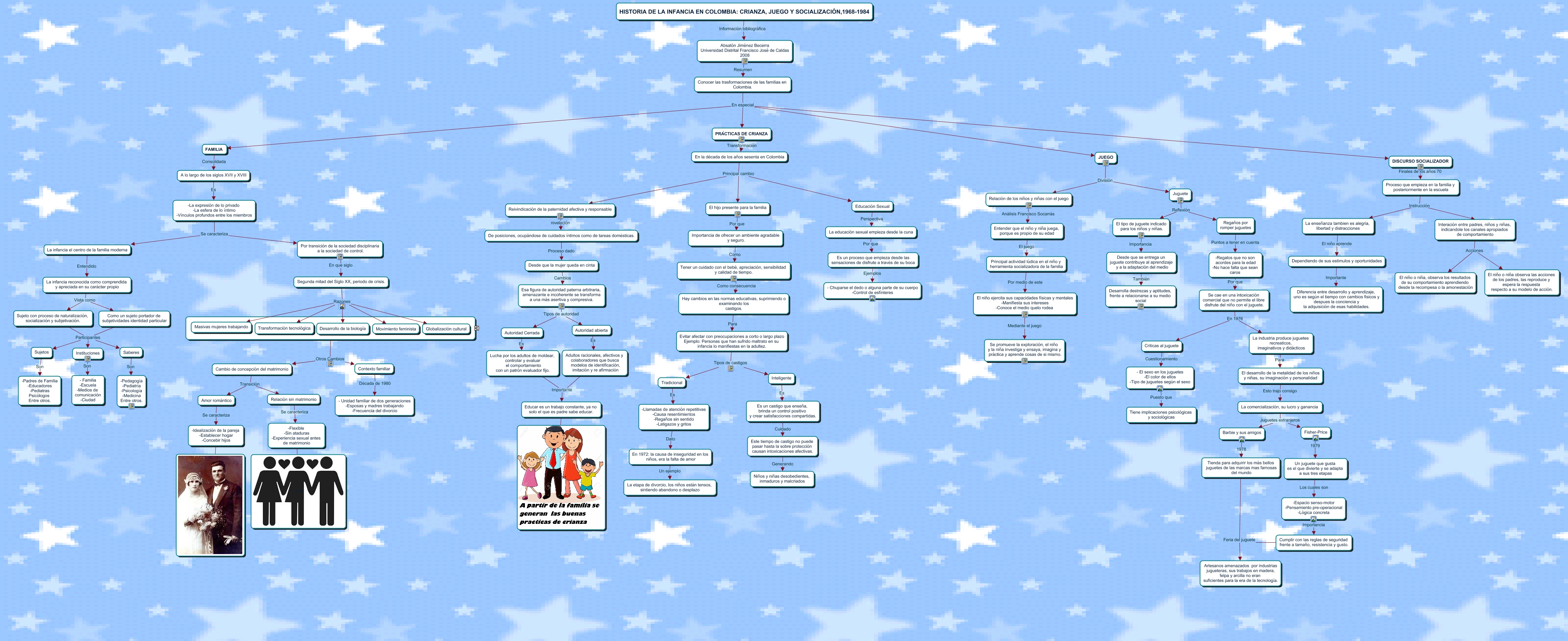 Este Cmap, tiene información relacionada con: TRABAJOOO PROCESOS.cmap, Segunda mitad del Siglo XX, periodo de crisis. Razones Desarrollo de la biología, En la década de los años sesenta en Colombia Principal cambio El hijo presente para la familia, -La expresión de lo privado -La esfera de lo íntimo -Vínculos profundos entre los miembros Se caracteriza Por transición de la sociedad disciplinaria a la sociedad de control., -Idealización de la pareja -Establecer hogar -Concebir hijos ???? ????, Sujeto con proceso de naturalización, socialización y subjetivación. Participantes Instituciones, Autoridad abierta Es Adultos racionales, afectivos y colaboradores que busca modelos de identificación, imitación y re afirmación, Saberes Son -Pedagogía -Pediatría -Psicología -Medicina Entre otros., Contexto familiar Década de 1980 - Unidad familiar de dos generaciones -Esposas y madres trabajando -Frecuencia del divorcio, Proceso que empieza en la familia y posteriormente en la escuela Instrucción Interación entre padres, niños y niñas, indicandole los canales apropiados de comportamiento, ???? Otros Cambios Contexto familiar, Por transición de la sociedad disciplinaria a la sociedad de control. En que siglo Segunda mitad del Siglo XX, periodo de crisis., En 1972: la causa de inseguridad en los niños, era la falta de amor Un ejemplo La etapa de divorcio, los niños están tensos, sintiendo abandono o desplazo, Relación de los niños y niñas con el juego Análisis Francisco Socarrás Entender que el niño y niña juega, porque es propio de su edad, Desde que la mujer queda en cinta Cambios Esa figura de autoridad paterna arbitraria, amenazante e incoherente se transforma a una más asertiva y compresiva., -Regalos que no son acordes para la edad -No hace falta que sean caros Por que Se cae en una intoxicación comercial que no permite el libre disfrute del niño con el juguete., Fisher-Price 1979 Un juguete que gusta es el que divierte y se adapta a sus tres etapas, Entender que el niño y niña juega, porque es propio de su edad El juego Principal actividad lúdica en el niño y herramienta socializadora de la familia, Barbie y sus amigos 1978 Tienda para adquirir los más bellos juguetes de las marcas mas famosas del mundo, Tienda para adquirir los más bellos juguetes de las marcas mas famosas del mundo Feria del juguete Artesanos amenazados por industrias jugueteras, sus trabajos en madera, felpa y arcilla no eran suficientes para la era de la tecnología., Cambio de concepción del matrimonio Transición Amor romántico