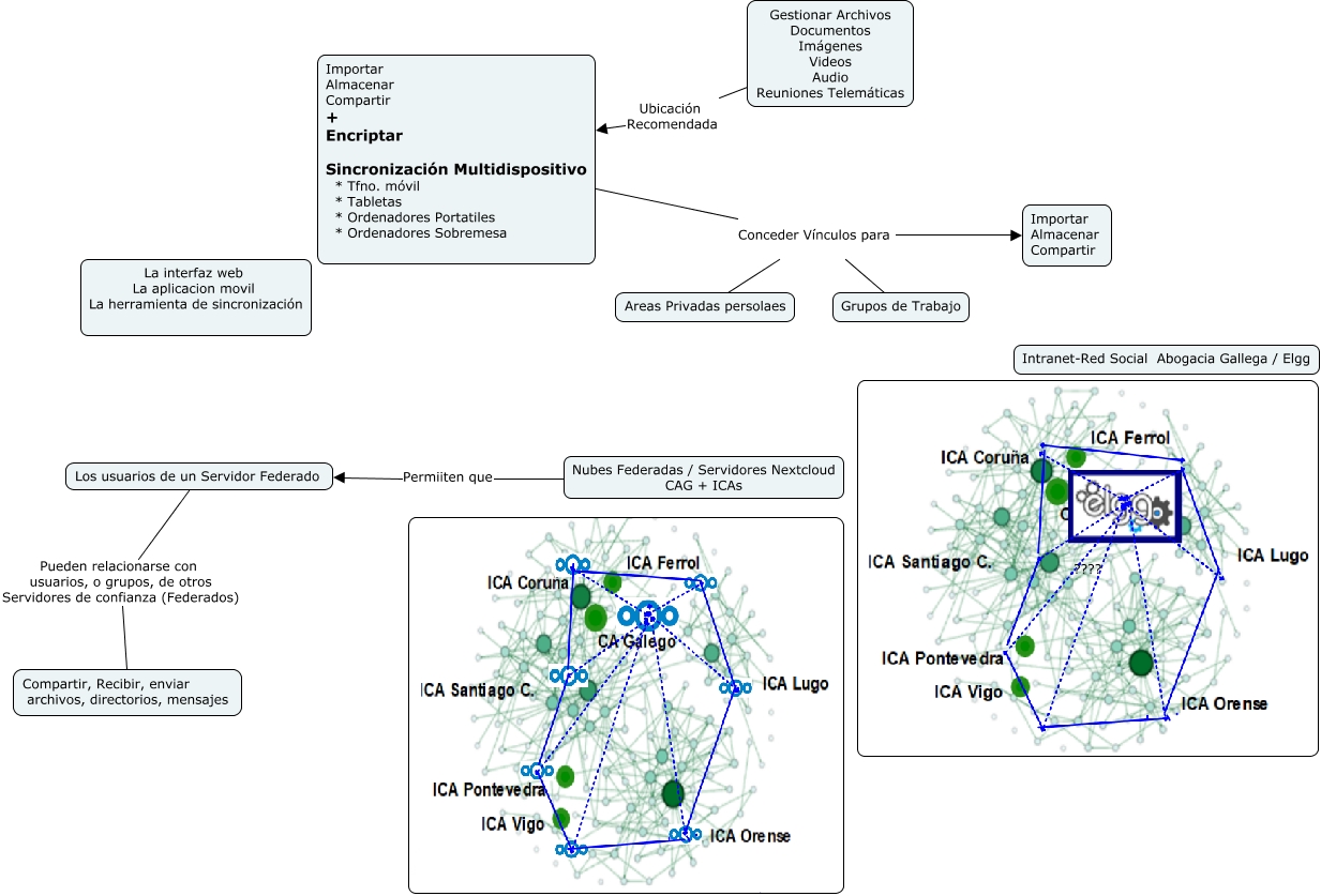 Este mapa conceptual ten información relativa a: Nextcloud_Elgg, Los usuarios de un Servidor Federado Pueden relacionarse con usuarios, o grupos, de otros Servidores de confianza (Federados) Compartir, Recibir, enviar archivos, directorios, mensajes, Nubes Federadas / Servidores Nextcloud CAG + ICAs Permiiten que Los usuarios de un Servidor Federado, Gestionar Archivos Documentos Imágenes Videos Audio Reuniones Telemáticas Ubicación Recomendada Importar Almacenar Compartir + Encriptar Sincronización Multidispositivo * Tfno. móvil * Tabletas * Ordenadores Portatiles * Ordenadores Sobremesa, Importar Almacenar Compartir + Encriptar Sincronización Multidispositivo * Tfno. móvil * Tabletas * Ordenadores Portatiles * Ordenadores Sobremesa Conceder Vínculos para Importar Almacenar Compartir, Importar Almacenar Compartir + Encriptar Sincronización Multidispositivo * Tfno. móvil * Tabletas * Ordenadores Portatiles * Ordenadores Sobremesa Conceder Vínculos para Grupos de Trabajo, Importar Almacenar Compartir + Encriptar Sincronización Multidispositivo * Tfno. móvil * Tabletas * Ordenadores Portatiles * Ordenadores Sobremesa Conceder Vínculos para Areas Privadas persolaes