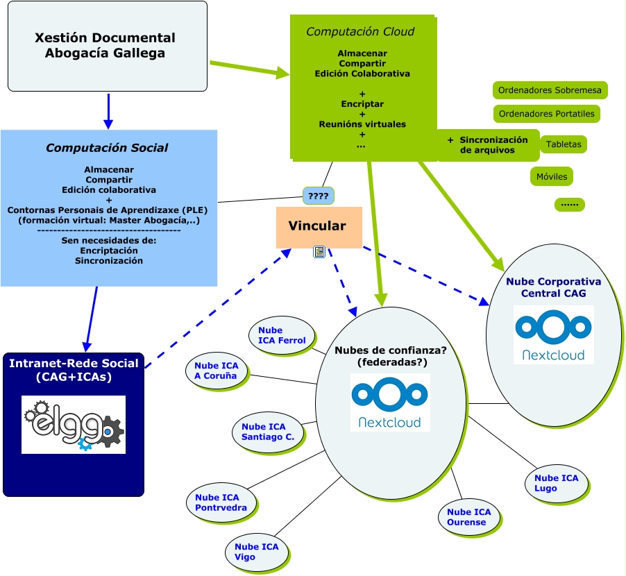 Este mapa conceptual ten información relativa a: CAG_CSocial&CCloud_gl, Nube ICA Santiago C. Red ICAs Nube ICA Ferrol, Nube ICA A Coruña Red ICAs Nube ICA Ourense, Nube ICA A Coruña Red ICAs Nube ICA Ferrol, Nube ICA Santiago C. Red ICAs Nube ICA Ourense, Nube ICA Santiago C. Red ICAs Nube ICA Lugo, Xestión Documental Abogacía Gallega Computación Social Almacenar Compartir Edición colaborativa + Contornas Personais de Aprendizaxe (PLE) (formación virtual: Master Abogacía,..) ------------------------------------ Sen necesidades de: Encriptación Sincronización ????, Intranet-Rede Social (CAG+ICAs) Vincular Nube Corporativa Central CAG, Nube ICA Santiago C. Red ICAs Nube ICA Ferrol, Nube ICA Santiago C. Red ICAs Nube ICA Ferrol, Nubes de confianza? (federadas?) Nube Corporativa Central CAG, Nube ICA A Coruña Red ICAs Nube ICA Pontrvedra, Nube ICA A Coruña Red ICAs Nube ICA Ferrol, Intranet-Rede Social (CAG+ICAs) Vincular Nubes de confianza? (federadas?), Nube ICA Santiago C. Red ICAs Nube ICA Pontrvedra, Nube ICA Ferrol Red ICAs Nube ICA Ourense, ???? Computación Cloud Almacenar Compartir Edición Colaborativa + Encriptar + Reunións virtuales + ... Nube Corporativa Central CAG, Nube ICA Ferrol Red ICAs Nube ICA Pontrvedra, Nube ICA Ferrol Red ICAs Nube ICA Vigo, Xestión Documental Abogacía Gallega Computación Social Almacenar Compartir Edición colaborativa + Contornas Personais de Aprendizaxe (PLE) (formación virtual: Master Abogacía,..) ------------------------------------ Sen necesidades de: Encriptación Sincronización Intranet-Rede Social (CAG+ICAs), Nube ICA Santiago C. Red ICAs Nube ICA Vigo