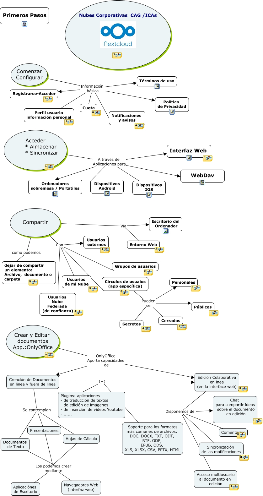 Este mapa conceptual ten información relativa a: Primeros_Pasos_Nubes_EdCol_AG_es, Edición Colaborativa en inea (en la interface web) Disponemos de Acceso multiusuario al documento en edición, Compartir Con Círculos de usuaios (app específica), Crear y Editar documentos App.:OnlyOffice OnlyOffice Aporta capacidades de Edición Colaborativa en inea (en la interface web), Compartir Vía Entorno Web, Documentos de Texto Los podemos crear mediante Aplicaciónes de Escritorio, Creación de Documentos en linea y fuera de linea Se contemplan Presentaciones, Creación de Documentos en linea y fuera de linea Se contemplan Hojas de Cálculo, Crear y Editar documentos App.:OnlyOffice OnlyOffice Aporta capacidades de Creación de Documentos en linea y fuera de linea, Presentaciones Los podemos crear mediante Navegadores Web (interfaz web), Creación de Documentos en linea y fuera de linea (+) Soporte para los formatos más comúnes de archivos: DOC, DOCX, TXT, ODT, RTF, ODP, EPUB, ODS, XLS, XLSX, CSV, PPTX, HTML, Creación de Documentos en linea y fuera de linea (+) Plugins: aplicaciones - de traducción de textos - de edición de imágenes - de inserción de videos Youtube - ......, Compartir como podemos dejar de compartir un elemento: Archivo, documento o carpeta, Comenzar Configurar Información básica Notificaciones y avisos, Acceder * Almacenar * Sincronizar A través de Aplicaciones para Ordenadores sobremesa / Portatiles, Círculos de usuaios (app específica) Pueden ser Cerrados, Edición Colaborativa en inea (en la interface web) Disponemos de Sincronización de las mofificaciones, Documentos de Texto Los podemos crear mediante Navegadores Web (interfaz web), Edición Colaborativa en inea (en la interface web) Disponemos de Chat para compartir ideas sobre el documento en edición, Hojas de Cálculo Los podemos crear mediante Aplicaciónes de Escritorio, Comenzar Configurar Información básica Términos de uso