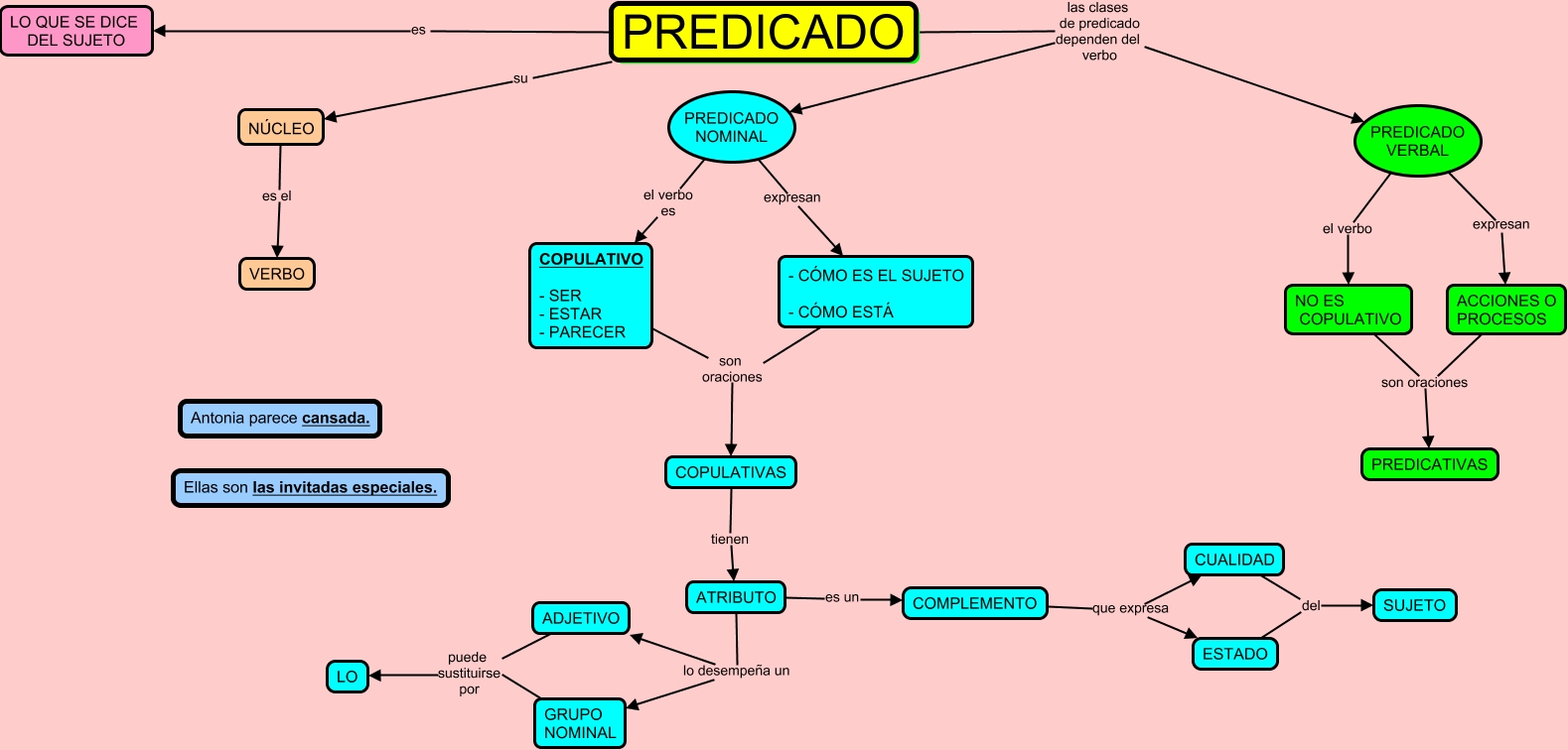 Este Cmap, tiene información relacionada con: PREDICADO 1, ACCIONES O PROCESOS son oraciones PREDICATIVAS, PREDICADO VERBAL expresan ACCIONES O PROCESOS, NÚCLEO es el VERBO, COMPLEMENTO que expresa CUALIDAD, COPULATIVAS tienen ATRIBUTO, COPULATIVO - SER - ESTAR - PARECER son oraciones COPULATIVAS, GRUPO NOMINAL puede sustituirse por LO, PREDICADO VERBAL el verbo NO ES COPULATIVO, COMPLEMENTO que expresa ESTADO, PREDICADO las clases de predicado dependen del verbo PREDICADO NOMINAL, NO ES COPULATIVO son oraciones PREDICATIVAS, PREDICADO es LO QUE SE DICE DEL SUJETO, PREDICADO NOMINAL expresan - CÓMO ES EL SUJETO - CÓMO ESTÁ, PREDICADO NOMINAL el verbo es COPULATIVO - SER - ESTAR - PARECER, PREDICADO su NÚCLEO, CUALIDAD del SUJETO, ATRIBUTO lo desempeña un GRUPO NOMINAL, ATRIBUTO lo desempeña un ADJETIVO, ESTADO del SUJETO, ATRIBUTO es un COMPLEMENTO