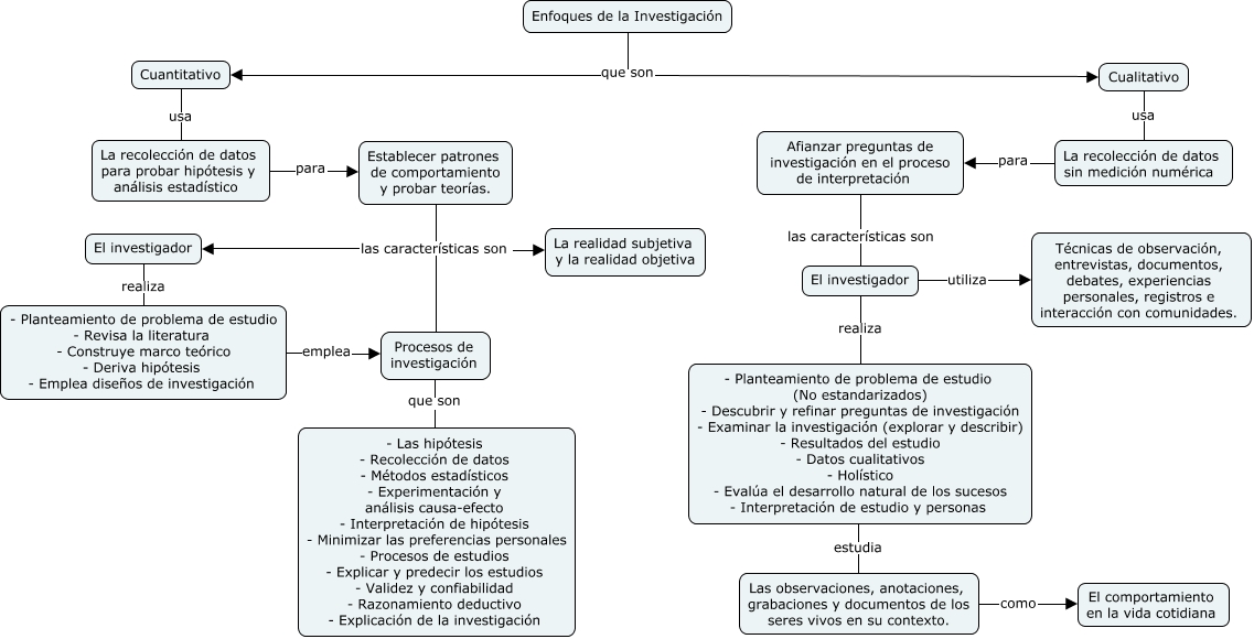 Este Cmap, tiene información relacionada con: Fundamentos, Las observaciones, anotaciones, grabaciones y documentos de los seres vivos en su contexto. como El comportamiento en la vida cotidiana, Afianzar preguntas de investigación en el proceso de interpretación las características son El investigador, Enfoques de la Investigación que son Cualitativo, Cualitativo usa La recolección de datos sin medición numérica, Cuantitativo usa La recolección de datos para probar hipótesis y análisis estadístico, Procesos de investigación que son - Las hipótesis - Recolección de datos - Métodos estadísticos - Experimentación y análisis causa-efecto - Interpretación de hipótesis - Minimizar las preferencias personales - Procesos de estudios - Explicar y predecir los estudios - Validez y confiabilidad - Razonamiento deductivo - Explicación de la investigación, La recolección de datos sin medición numérica para Afianzar preguntas de investigación en el proceso de interpretación, Establecer patrones de comportamiento y probar teorías. las características son Procesos de investigación, Enfoques de la Investigación que son Cuantitativo, El investigador utiliza Técnicas de observación, entrevistas, documentos, debates, experiencias personales, registros e interacción con comunidades., - Planteamiento de problema de estudio - Revisa la literatura - Construye marco teórico - Deriva hipótesis - Emplea diseños de investigación emplea Procesos de investigación, Establecer patrones de comportamiento y probar teorías. las características son El investigador, El investigador realiza - Planteamiento de problema de estudio - Revisa la literatura - Construye marco teórico - Deriva hipótesis - Emplea diseños de investigación, Establecer patrones de comportamiento y probar teorías. las características son La realidad subjetiva y la realidad objetiva, La recolección de datos para probar hipótesis y análisis estadístico para Establecer patrones de comportamiento y probar teorías., El investigador realiza - Planteamiento de problema de estudio (No estandarizados) - Descubrir y refinar preguntas de investigación - Examinar la investigación (explorar y describir) - Resultados del estudio - Datos cualitativos - Holístico - Evalúa el desarrollo natural de los sucesos - Interpretación de estudio y personas, - Planteamiento de problema de estudio (No estandarizados) - Descubrir y refinar preguntas de investigación - Examinar la investigación (explorar y describir) - Resultados del estudio - Datos cualitativos - Holístico - Evalúa el desarrollo natural de los sucesos - Interpretación de estudio y personas estudia Las observaciones, anotaciones, grabaciones y documentos de los seres vivos en su contexto.