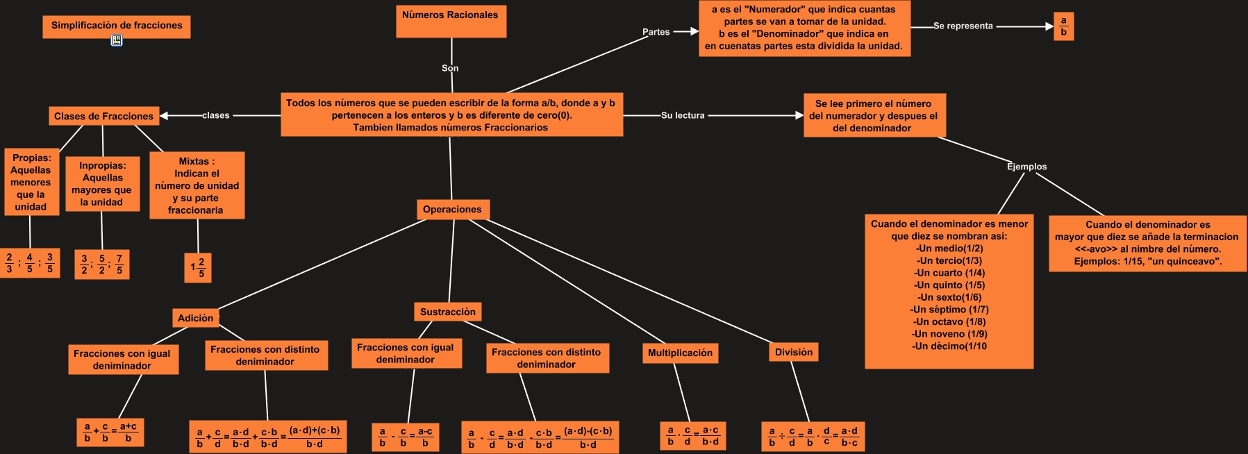 Este Cmap, tiene información relacionada con: Numeros racionales (Fracciones), Sustracción ???? Fracciones con distinto deniminador, Multiplicación ???? <math xmlns="http://www.w3.org/1998/Math/MathML"> <mrow> <mfrac> <mtext> a </mtext> <mtext> b </mtext> </mfrac> <mtext> ⋅ </mtext> <mfrac> <mtext> c </mtext> <mtext> d </mtext> </mfrac> <mtext> = </mtext> <mfrac> <mtext> a⋅c </mtext> <mtext> b⋅d </mtext> </mfrac> </mrow> </math>, Todos los números que se pueden escribir de la forma a/b, donde a y b pertenecen a los enteros y b es diferente de cero(0). Tambien llamados números Fraccionarios clases Clases de Fracciones, Operaciones ???? Adición, Todos los números que se pueden escribir de la forma a/b, donde a y b pertenecen a los enteros y b es diferente de cero(0). Tambien llamados números Fraccionarios ???? ????, Operaciones ???? Sustracción, Fracciones con igual deniminador ???? <math xmlns="http://www.w3.org/1998/Math/MathML"> <mrow> <mfrac> <mtext> a </mtext> <mtext> b </mtext> </mfrac> <mtext> + </mtext> <mfrac> <mtext> c </mtext> <mtext> b </mtext> </mfrac> <mtext> = </mtext> <mfrac> <mtext> a+c </mtext> <mtext> b </mtext> </mfrac> </mrow> </math>, Operaciones ???? División, Números Racionales Son Todos los números que se pueden escribir de la forma a/b, donde a y b pertenecen a los enteros y b es diferente de cero(0). Tambien llamados números Fraccionarios, Mixtas : Indican el número de unidad y su parte fraccionaria ???? <math xmlns="http://www.w3.org/1998/Math/MathML"> <mrow> <mtext> 1 </mtext> <mfrac> <mtext> 2 </mtext> <mtext> 5 </mtext> </mfrac> </mrow> </math>, Clases de Fracciones ???? Mixtas : Indican el número de unidad y su parte fraccionaria, Operaciones ???? Multiplicación, Clases de Fracciones ???? Propias: Aquellas menores que la unidad, Fracciones con igual deniminador ???? <math xmlns="http://www.w3.org/1998/Math/MathML"> <mrow> <mfrac> <mtext> a </mtext> <mtext> b </mtext> </mfrac> <mtext> - </mtext> <mfrac> <mtext> c </mtext> <mtext> b </mtext> </mfrac> <mtext> = </mtext> <mfrac> <mtext> a-c </mtext> <mtext> b </mtext> </mfrac> </mrow> </math>, Clases de Fracciones ???? Inpropias: Aquellas mayores que la unidad, Adición ???? Fracciones con distinto deniminador, Se lee primero el número del numerador y despues el del denominador Ejemplos Cuando el denominador es mayor que diez se añade la terminacion <<-avo>> al nimbre del número. Ejemplos: 1/15, "un quinceavo"., División ???? <math xmlns="http://www.w3.org/1998/Math/MathML"> <mrow> <mfrac> <mtext> a </mtext> <mtext> b </mtext> </mfrac> <mtext> ÷ </mtext> <mfrac> <mtext> c </mtext> <mtext> d </mtext> </mfrac> <mtext> = </mtext> <mfrac> <mtext> a </mtext> <mtext> b </mtext> </mfrac> <mtext> ⋅ </mtext> <mfrac> <mtext> d </mtext> <mtext> c </mtext> </mfrac> <mtext> = </mtext> <mfrac> <mtext> a⋅d </mtext> <mtext> b⋅c </mtext> </mfrac> </mrow> </math>, Propias: Aquellas menores que la unidad ???? <math xmlns="http://www.w3.org/1998/Math/MathML"> <mrow> <mfrac> <mtext> 2 </mtext> <mtext> 3 </mtext> </mfrac> <mtext> ; </mtext> <mfrac> <mtext> 4 </mtext> <mtext> 5 </mtext> </mfrac> <mtext> ; </mtext> <mfrac> <mtext> 3 </mtext> <mtext> 5 </mtext> </mfrac> </mrow> </math>, Adición ???? Fracciones con igual deniminador