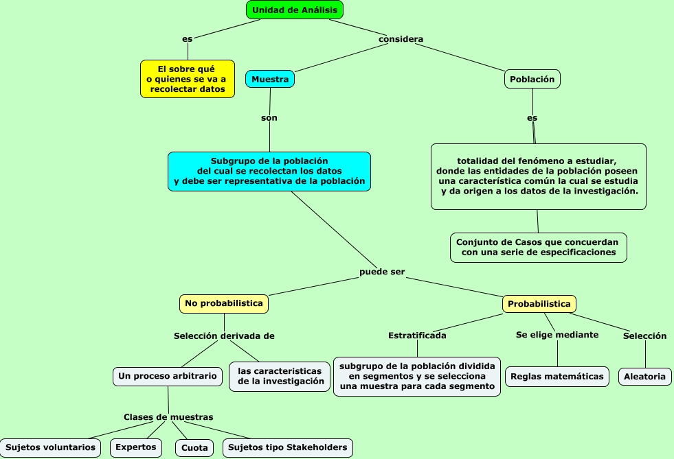 Este Cmap, tiene información relacionada con: Mapa del capitulo 8 de Sampieri, Subgrupo de la población del cual se recolectan los datos y debe ser representativa de la población puede ser Probabilistica, Población es Conjunto de Casos que concuerdan con una serie de especificaciones, Un proceso arbitrario Clases de muestras Sujetos tipo Stakeholders, Población es totalidad del fenómeno a estudiar, donde las entidades de la población poseen una característica común la cual se estudia y da origen a los datos de la investigación., No probabilistica Selección derivada de las caracteristicas de la investigación, Unidad de Análisis considera Muestra, No probabilistica Selección derivada de Un proceso arbitrario, Probabilistica Se elige mediante Reglas matemáticas, Un proceso arbitrario Clases de muestras Sujetos voluntarios, Muestra son Subgrupo de la población del cual se recolectan los datos y debe ser representativa de la población, Un proceso arbitrario Clases de muestras Cuota, Un proceso arbitrario Clases de muestras Expertos, Unidad de Análisis considera Población, Probabilistica Selección Aleatoria, Probabilistica Estratificada subgrupo de la población dividida en segmentos y se selecciona una muestra para cada segmento, Subgrupo de la población del cual se recolectan los datos y debe ser representativa de la población puede ser No probabilistica, Unidad de Análisis es El sobre qué o quienes se va a recolectar datos