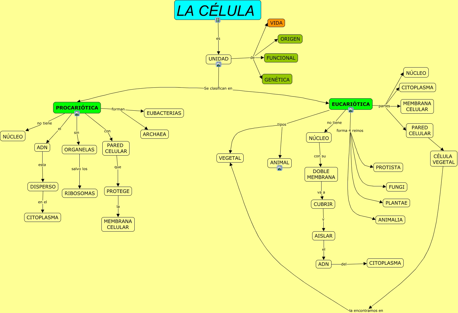 Este Cmap, tiene información relacionada con: LA CELULA, EUCARIÓTICA tipos VEGETAL, EUCARIÓTICA partes PARED CELULAR, EUCARIÓTICA forma 4 reinos ANIMALIA, EUCARIÓTICA partes MEMBRANA CELULAR, PROCARIÓTICA no tiene NÚCLEO, CÉLULA VEGETAL la encontramos en VEGETAL, ORGANELAS salvo los RIBOSOMAS, UNIDAD de GENÉTICA, EUCARIÓTICA forma 4 reinos PROTISTA, PROCARIÓTICA forman EUBACTERIAS, PROCARIÓTICA con PARED CELULAR, PARED CELULAR CÉLULA VEGETAL, EUCARIÓTICA tipos ANIMAL, CUBRIR Y AISLAR, DISPERSO en el CITOPLASMA, UNIDAD de FUNCIONAL, PROCARIÓTICA forman ARCHAEA, EUCARIÓTICA forma 4 reinos FUNGI, UNIDAD Se clasifican en EUCARIÓTICA, LA CÉLULA es UNIDAD