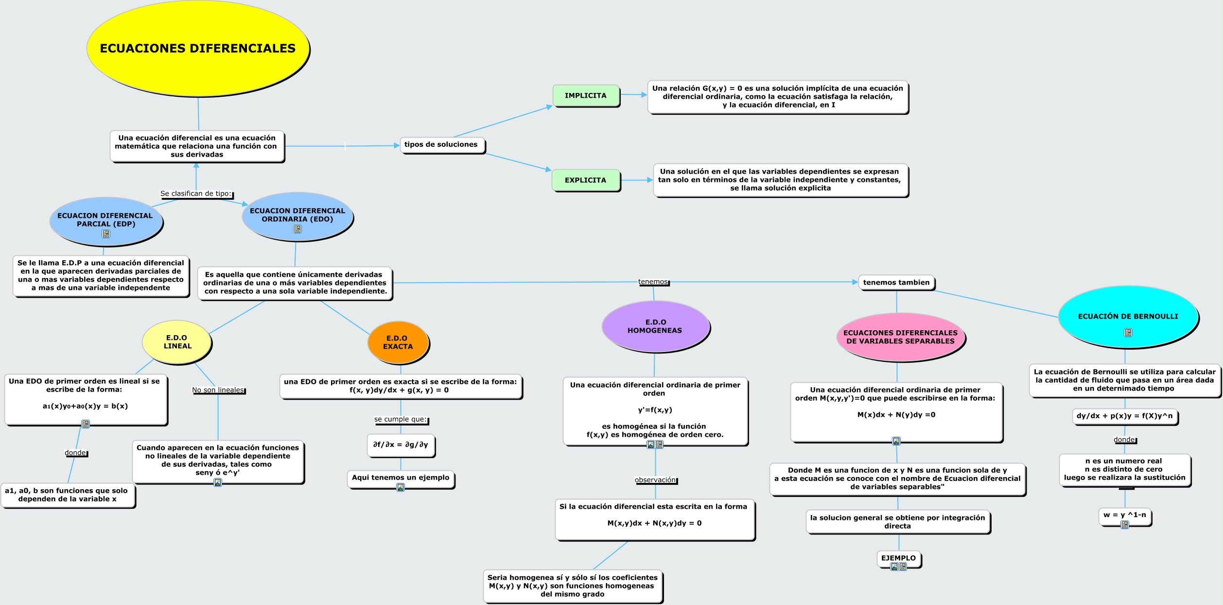 Este Cmap, tiene información relacionada con: ECUACIONES DIFERENCIALES MAPA CONCEPTUAL, IMPLICITA ???? Una relación G(x,y) = 0 es una solución implícita de una ecuación diferencial ordinaria, como la ecuación satisfaga la relación, y la ecuación diferencial, en I, Es aquella que contiene únicamente derivadas ordinarias de una o más variables dependientes con respecto a una sola variable independiente. tenemos tenemos tambien, E.D.O LINEAL No son lineales Cuando aparecen en la ecuación funciones no lineales de la variable dependiente de sus derivadas, tales como seny ó e^y', E.D.O LINEAL ???? Una EDO de primer orden es lineal si se escribe de la forma: a1(x)y0+a0(x)y = b(x), E.D.O HOMOGENEAS ???? Una ecuación diferencial ordinaria de primer orden y'=f(x,y) es homogénea si la función f(x,y) es homogénea de orden cero., Una EDO de primer orden es lineal si se escribe de la forma: a1(x)y0+a0(x)y = b(x) donde a1, a0, b son funciones que solo dependen de la variable x, ∂f/∂x = ∂g/∂y ???? Aqui tenemos un ejemplo, Una ecuación diferencial es una ecuación matemática que relaciona una función con sus derivadas tipos de soluciones, Si la ecuación diferencial esta escrita en la forma M(x,y)dx + N(x,y)dy = 0 ???? Seria homogenea sí y sólo sí los coeficientes M(x,y) y N(x,y) son funciones homogeneas del mismo grado, ECUACIÓN DE BERNOULLI ???? La ecuación de Bernoulli se utiliza para calcular la cantidad de fluido que pasa en un área dada en un deternimado tiempo, La ecuación de Bernoulli se utiliza para calcular la cantidad de fluido que pasa en un área dada en un deternimado tiempo ???? dy/dx + p(x)y = f(X)y^n, Una ecuación diferencial ordinaria de primer orden y'=f(x,y) es homogénea si la función f(x,y) es homogénea de orden cero. observación Si la ecuación diferencial esta escrita en la forma M(x,y)dx + N(x,y)dy = 0, ECUACIONES DIFERENCIALES ???? Una ecuación diferencial es una ecuación matemática que relaciona una función con sus derivadas, Es aquella que contiene únicamente derivadas ordinarias de una o más variables dependientes con respecto a una sola variable independiente. ???? E.D.O EXACTA, Es aquella que contiene únicamente derivadas ordinarias de una o más variables dependientes con respecto a una sola variable independiente. tenemos E.D.O HOMOGENEAS, ECUACION DIFERENCIAL PARCIAL (EDP) ???? Se le llama E.D.P a una ecuación diferencial en la que aparecen derivadas parciales de una o mas variables dependientes respecto a mas de una variable independente, Una ecuación diferencial ordinaria de primer orden M(x,y,y')=0 que puede escribirse en la forma: M(x)dx + N(y)dy =0 ???? Donde M es una funcion de x y N es una funcion sola de y a esta ecuación se conoce con el nombre de Ecuacion diferencial de variables separables", tipos de soluciones ???? IMPLICITA, ECUACION DIFERENCIAL PARCIAL (EDP) Se clasifican de tipo: ECUACION DIFERENCIAL ORDINARIA (EDO), ECUACION DIFERENCIAL PARCIAL (EDP) Se clasifican de tipo: Una ecuación diferencial es una ecuación matemática que relaciona una función con sus derivadas