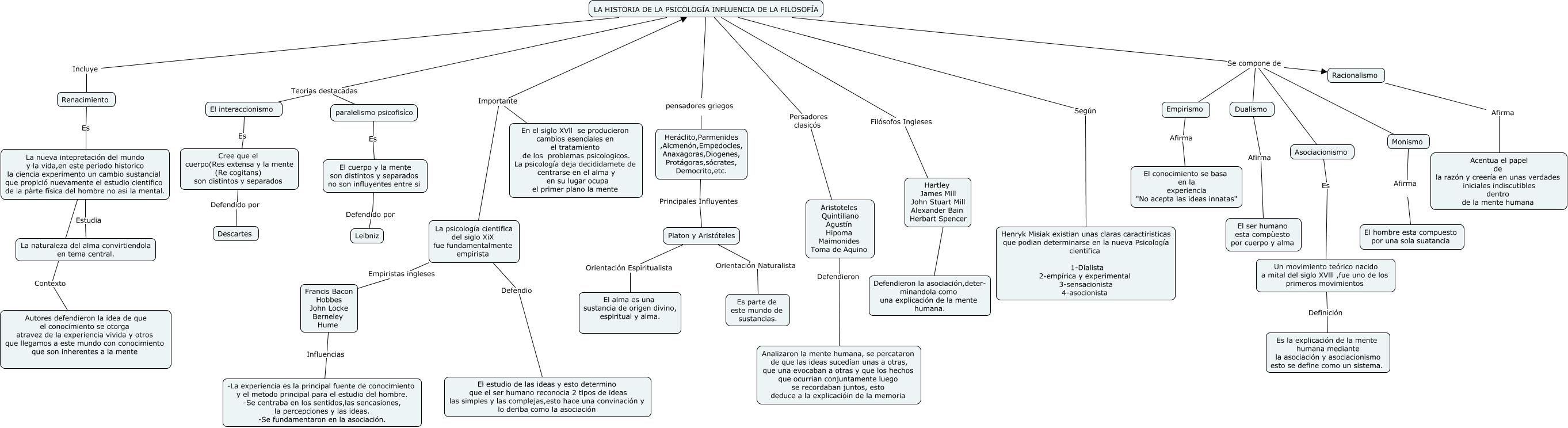 Este Cmap, tiene información relacionada con: FILOSOFÍA, LA HISTORIA DE LA PSICOLOGÍA INFLUENCIA DE LA FILOSOFÍA Se compone de Asociacionismo, LA HISTORIA DE LA PSICOLOGÍA INFLUENCIA DE LA FILOSOFÍA Se compone de Dualismo, Un movimiento teórico nacido a mital del siglo XVlll ,fue uno de los primeros movimientos Definición Es la explicación de la mente humana mediante la asociación y asociacionismo esto se define como un sistema., El cuerpo y la mente son distintos y separados no son influyentes entre si Defendido por Leibniz, LA HISTORIA DE LA PSICOLOGÍA INFLUENCIA DE LA FILOSOFÍA Según Henryk Misiak existian unas claras caractiristicas que podian determinarse en la nueva Psicología cientifica 1-Dialista 2-empírica y experimental 3-sensacionista 4-asocionista, paralelismo psicofisíco Es El cuerpo y la mente son distintos y separados no son influyentes entre si, LA HISTORIA DE LA PSICOLOGÍA INFLUENCIA DE LA FILOSOFÍA Se compone de Monismo, La nueva intepretación del mundo y la vida,en este periodo historico la ciencia experimento un cambio sustancial que propició nuevamente el estudio cientifico de la pàrte física del hombre no asi la mental. Estudia La naturaleza del alma convirtiendola en tema central., LA HISTORIA DE LA PSICOLOGÍA INFLUENCIA DE LA FILOSOFÍA Se compone de Empirismo, Monismo Afirma El hombre esta compuesto por una sola suatancia, Platon y Aristóteles Orientación Espiritualista El alma es una sustancia de origen divino, espiritual y alma., La nueva intepretación del mundo y la vida,en este periodo historico la ciencia experimento un cambio sustancial que propició nuevamente el estudio cientifico de la pàrte física del hombre no asi la mental. Contexto Autores defendieron la idea de que el conocimiento se otorga atravez de la experiencia vivida y otros que llegamos a este mundo con conocimiento que son inherentes a la mente, Dualismo Afirma El ser humano esta compùesto por cuerpo y alma, LA HISTORIA DE LA PSICOLOGÍA INFLUENCIA DE LA FILOSOFÍA Se compone de Racionalismo, En el siglo XVll se producieron cambios esenciales en el tratamiento de los problemas psicologicos. La psicología deja decididamete de centrarse en el alma y en su lugar ocupa el primer plano la mente Importante La psicología cientifica del siglo XiX fue fundamentalmente empirista, Renacimiento Es La nueva intepretación del mundo y la vida,en este periodo historico la ciencia experimento un cambio sustancial que propició nuevamente el estudio cientifico de la pàrte física del hombre no asi la mental., Racionalismo Afirma Acentua el papel de la razón y creería en unas verdades iniciales indiscutibles dentro de la mente humana, LA HISTORIA DE LA PSICOLOGÍA INFLUENCIA DE LA FILOSOFÍA pensadores griegos Heráclito,Parmenides ,Alcmenón,Empedocles, Anaxagoras,Diogenes, Protágoras,sócrates, Democrito,etc., Asociacionismo Es Un movimiento teórico nacido a mital del siglo XVlll ,fue uno de los primeros movimientos, Empirismo Afirma El conocimiento se basa en la experiencia "No acepta las ideas innatas"