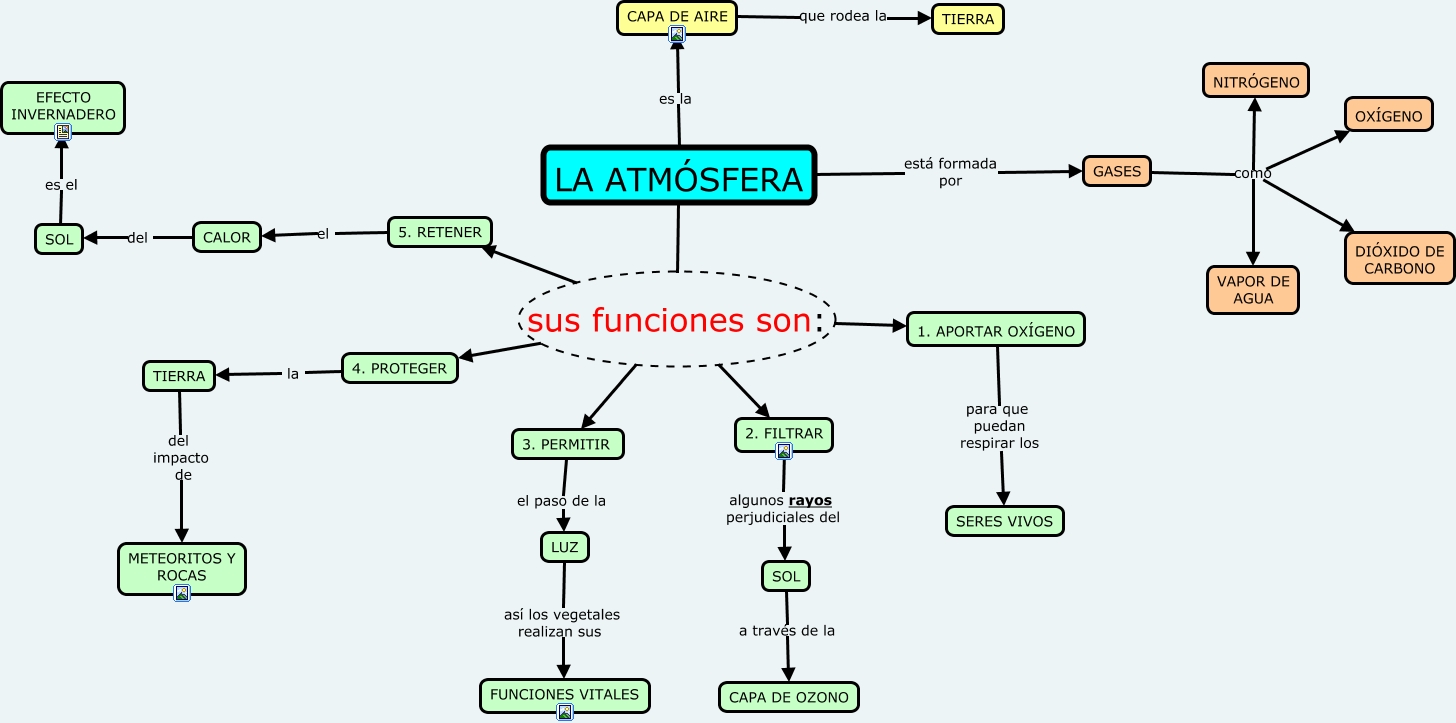 Este Cmap, tiene información relacionada con: LA ATMÓSFERA, LA ATMÓSFERA sus funciones son: 1. APORTAR OXÍGENO, CAPA DE AIRE que rodea la TIERRA, SOL a través de la CAPA DE OZONO, LUZ así los vegetales realizan sus FUNCIONES VITALES, LA ATMÓSFERA está formada por GASES, LA ATMÓSFERA sus funciones son: 4. PROTEGER, GASES como OXÍGENO, SOL es el EFECTO INVERNADERO, LA ATMÓSFERA sus funciones son: 5. RETENER, 5. RETENER el CALOR, 1. APORTAR OXÍGENO para que puedan respirar los SERES VIVOS, TIERRA del impacto de METEORITOS Y ROCAS, LA ATMÓSFERA es la CAPA DE AIRE, CALOR del SOL, GASES como NITRÓGENO, GASES como VAPOR DE AGUA, LA ATMÓSFERA sus funciones son: 3. PERMITIR, GASES como DIÓXIDO DE CARBONO, LA ATMÓSFERA sus funciones son: 2. FILTRAR, 4. PROTEGER la TIERRA