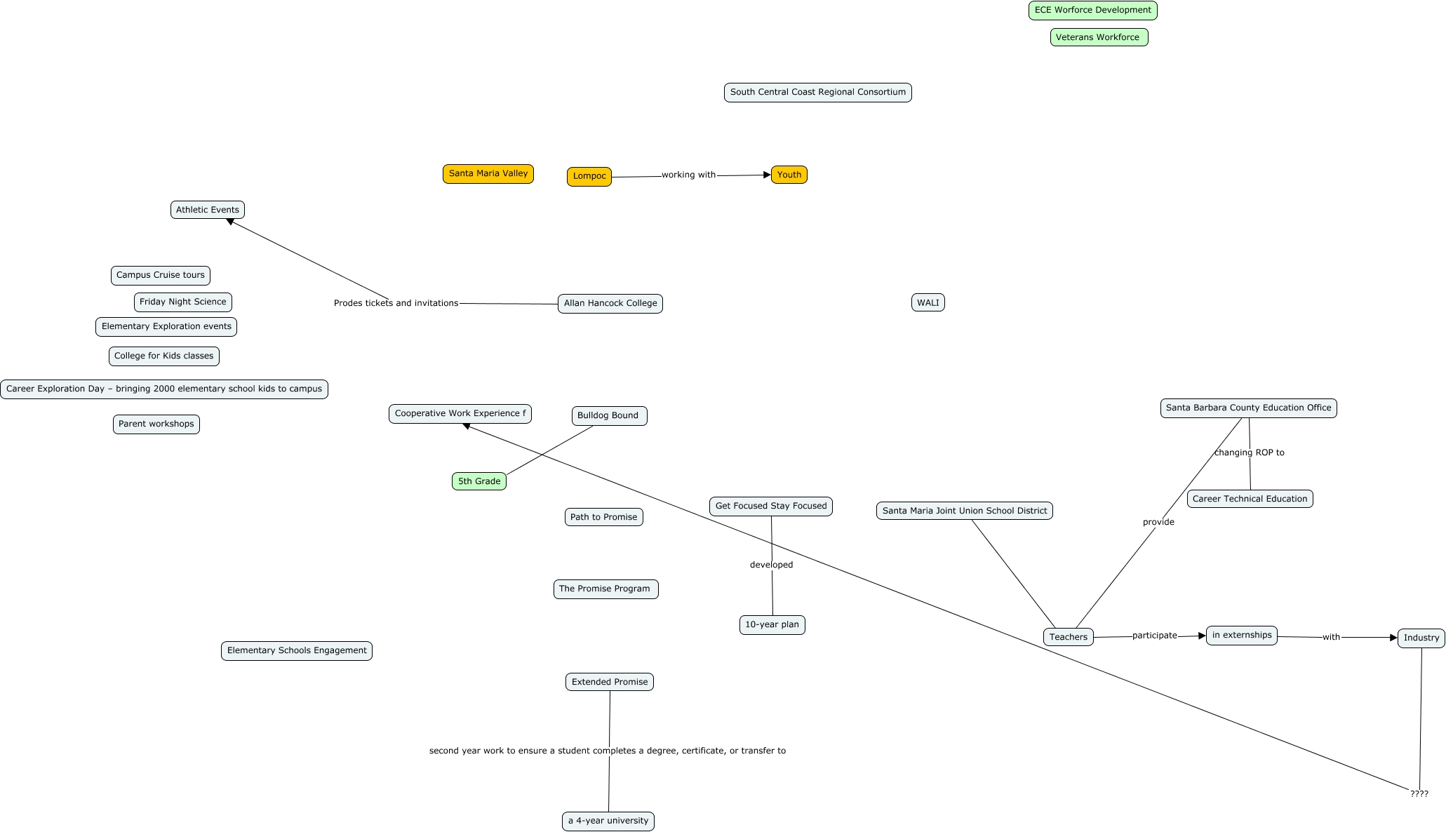 This Concept Map, created with IHMC CmapTools, has information related to: 093019WorkforceDev, Industry ???? Cooperative Work Experience f, Extended Promise second year work to ensure a student completes a degree, certificate, or transfer to a 4-year university, Allan Hancock College Prodes tickets and invitations Athletic Events, Bulldog Bound 5th Grade, Santa Barbara County Education Office provide Teachers, Santa Maria Joint Union School District Teachers, Santa Barbara County Education Office changing ROP to Career Technical Education, Lompoc working with Youth, Teachers participate in externships, Get Focused Stay Focused developed 10-year plan, in externships with Industry