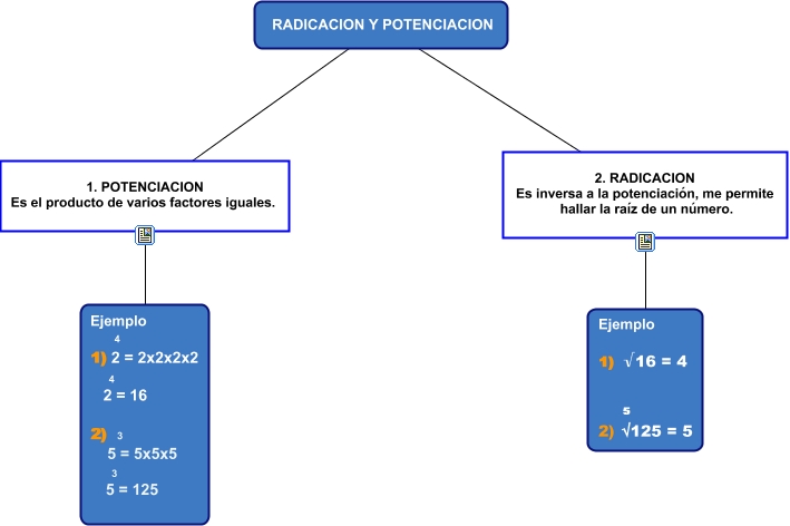 Este Cmap, tiene información relacionada con: POTENCIACION Y RADICACION, RADICACION Y POTENCIACION 1. POTENCIACION Es el producto de varios factores iguales. Ejemplo 4 1) 2 = 2x2x2x2 4 2 = 16 2) 3 5 = 5x5x5 3 5 = 125, RADICACION Y POTENCIACION 2. RADICACION Es inversa a la potenciación, me permite hallar la raíz de un número. Ejemplo 1) √16 = 4 5 2) √125 = 5
