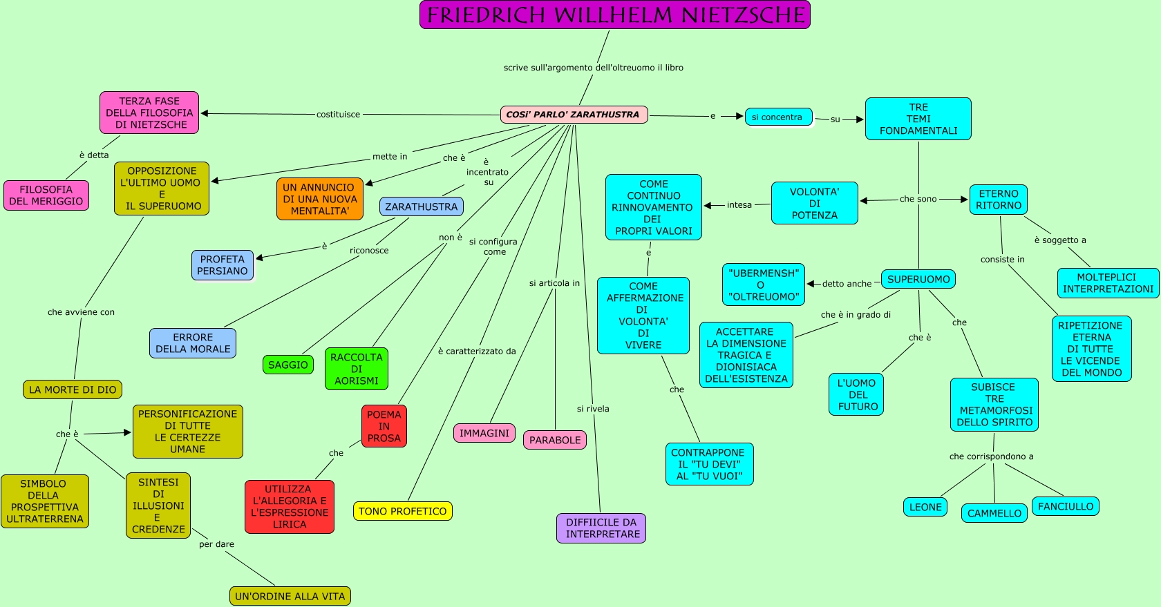 Questa Cmap, creata con IHMC CmapTools, contiene informazioni relative a: Nietzsche, TRE TEMI FONDAMENTALI che sono VOLONTA' DI POTENZA, LA MORTE DI DIO che è SIMBOLO DELLA PROSPETTIVA ULTRATERRENA, TRE TEMI FONDAMENTALI che sono ETERNO RITORNO, COME AFFERMAZIONE DI VOLONTA' DI VIVERE che CONTRAPPONE IL "TU DEVI" AL "TU VUOI", SUPERUOMO che è L'UOMO DEL FUTURO, COSi' PARLO' ZARATHUSTRA e si concentra, SUBISCE TRE METAMORFOSI DELLO SPIRITO che corrispondono a LEONE, COSi' PARLO' ZARATHUSTRA si articola in PARABOLE, LA MORTE DI DIO che è PERSONIFICAZIONE DI TUTTE LE CERTEZZE UMANE, ETERNO RITORNO è soggetto a MOLTEPLICI INTERPRETAZIONI, ZARATHUSTRA è PROFETA PERSIANO, OPPOSIZIONE L'ULTIMO UOMO E IL SUPERUOMO che avviene con LA MORTE DI DIO, COSi' PARLO' ZARATHUSTRA si rivela DIFFIICILE DA INTERPRETARE, SINTESI DI ILLUSIONI E CREDENZE per dare UN'ORDINE ALLA VITA, COSi' PARLO' ZARATHUSTRA si configura come POEMA IN PROSA, TRE TEMI FONDAMENTALI che sono SUPERUOMO, COSi' PARLO' ZARATHUSTRA non è SAGGIO, POEMA IN PROSA che UTILIZZA L'ALLEGORIA E L'ESPRESSIONE LIRICA, COME CONTINUO RINNOVAMENTO DEI PROPRI VALORI e COME AFFERMAZIONE DI VOLONTA' DI VIVERE, ETERNO RITORNO consiste in RIPETIZIONE ETERNA DI TUTTE LE VICENDE DEL MONDO