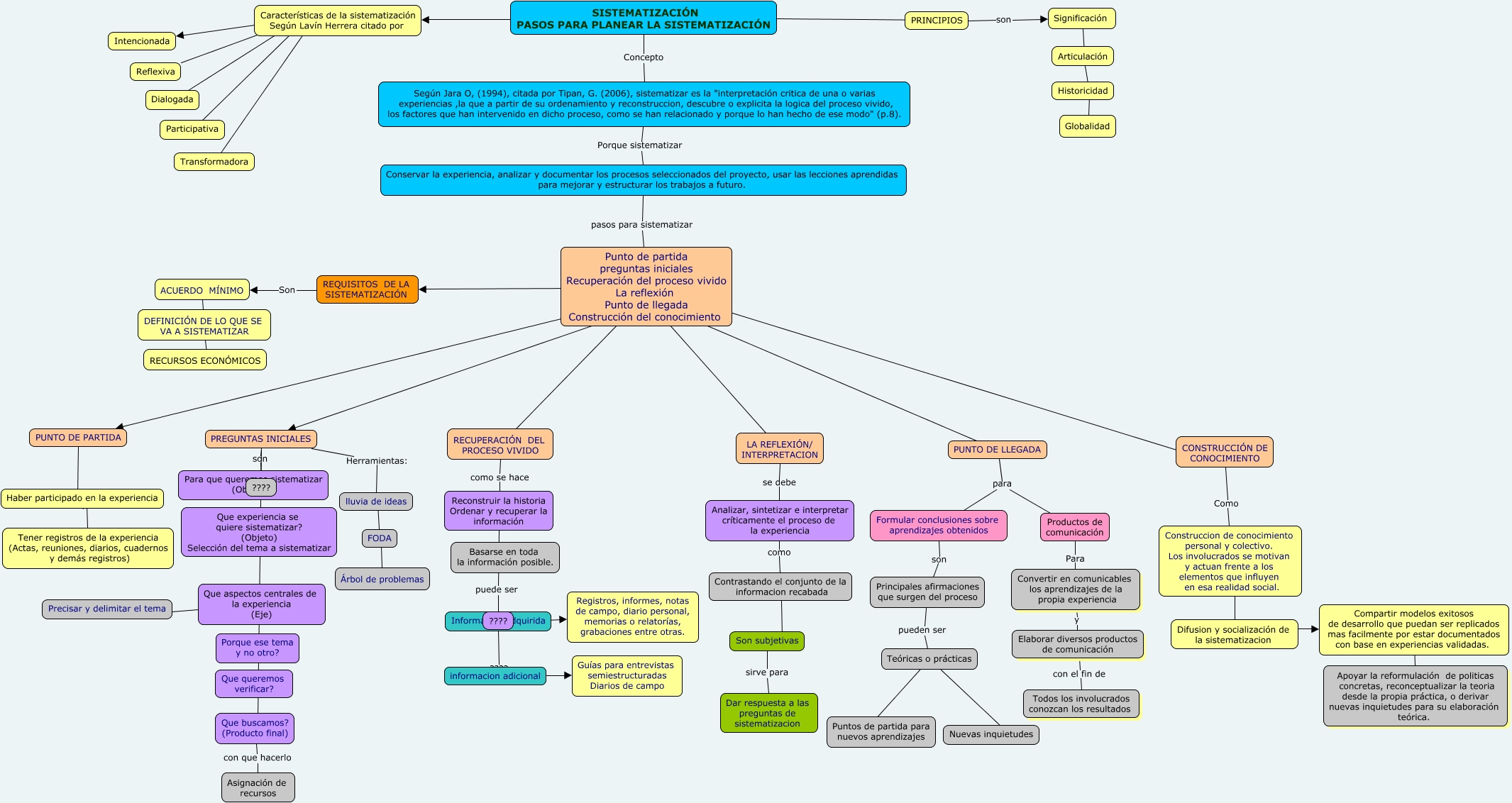Este Cmap, tiene información relacionada con: ACTIVIDAD 5 SISTEMACIZACION-PASOS, Analizar, sintetizar e interpretar críticamente el proceso de la experiencia como Contrastando el conjunto de la informacion recabada, CONSTRUCCIÓN DE CONOCIMIENTO Como Construccion de conocimiento personal y colectivo. Los involucrados se motivan y actuan frente a los elementos que influyen en esa realidad social., SISTEMATIZACIÓN PASOS PARA PLANEAR LA SISTEMATIZACIÓN ???? PRINCIPIOS, informacion adicional ???? Guías para entrevistas semiestructuradas Diarios de campo, PREGUNTAS INICIALES ???? Que buscamos? (Producto final), LA REFLEXIÓN/ INTERPRETACION se debe Analizar, sintetizar e interpretar críticamente el proceso de la experiencia, PUNTO DE LLEGADA para Productos de comunicación, PREGUNTAS INICIALES Herramientas: lluvia de ideas, SISTEMATIZACIÓN PASOS PARA PLANEAR LA SISTEMATIZACIÓN Concepto Según Jara O, (1994), citada por Tipan, G. (2006), sistematizar es la "interpretación critica de una o varias experiencias ,la que a partir de su ordenamiento y reconstruccion, descubre o explicita la logica del proceso vivido, los factores que han intervenido en dicho proceso, como se han relacionado y porque lo han hecho de ese modo" (p.8)., Según Jara O, (1994), citada por Tipan, G. (2006), sistematizar es la "interpretación critica de una o varias experiencias ,la que a partir de su ordenamiento y reconstruccion, descubre o explicita la logica del proceso vivido, los factores que han intervenido en dicho proceso, como se han relacionado y porque lo han hecho de ese modo" (p.8). Porque sistematizar Conservar la experiencia, analizar y documentar los procesos seleccionados del proyecto, usar las lecciones aprendidas para mejorar y estructurar los trabajos a futuro., Conservar la experiencia, analizar y documentar los procesos seleccionados del proyecto, usar las lecciones aprendidas para mejorar y estructurar los trabajos a futuro. pasos para sistematizar Punto de partida preguntas iniciales Recuperación del proceso vivido La reflexión Punto de llegada Construcción del conocimiento, Construccion de conocimiento personal y colectivo. Los involucrados se motivan y actuan frente a los elementos que influyen en esa realidad social. ???? Difusion y socialización de la sistematizacion, Formular conclusiones sobre aprendizajes obtenidos son Principales afirmaciones que surgen del proceso, Teóricas o prácticas ???? Nuevas inquietudes, RECUPERACIÓN DEL PROCESO VIVIDO como se hace Reconstruir la historia Ordenar y recuperar la información, Reconstruir la historia Ordenar y recuperar la información puede ser Informacion adquirida, ACUERDO MÍNIMO ???? DEFINICIÓN DE LO QUE SE VA A SISTEMATIZAR, Características de la sistematización Según Lavín Herrera citado por ???? Reflexiva, PUNTO DE LLEGADA para Formular conclusiones sobre aprendizajes obtenidos, Características de la sistematización Según Lavín Herrera citado por ???? Dialogada