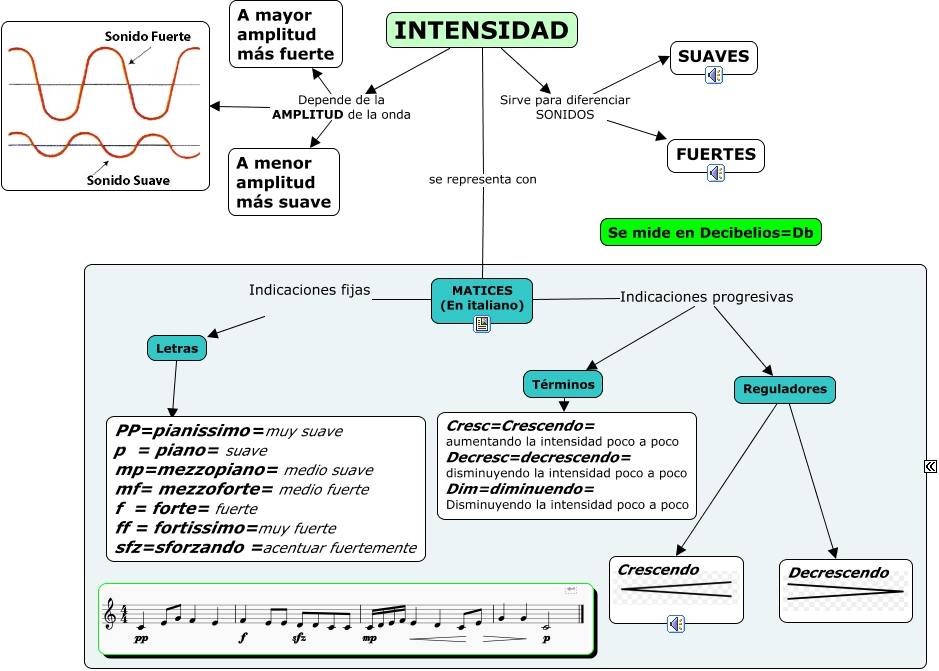 Este Cmap, tiene información relacionada con: T05_La_intensidad, Términos Cresc=Crescendo= aumentando la intensidad poco a poco Decresc=decrescendo= disminuyendo la intensidad poco a poco Dim=diminuendo= Disminuyendo la intensidad poco a poco, Letras ????, MATICES (En italiano) Indicaciones fijas Letras, INTENSIDAD se representa con MATICES (En italiano), INTENSIDAD Depende de la AMPLITUD de la onda A mayor amplitud más fuerte, MATICES (En italiano) Indicaciones progresivas Términos, INTENSIDAD Depende de la AMPLITUD de la onda, INTENSIDAD Depende de la AMPLITUD de la onda A menor amplitud más suave, Reguladores Crescendo, Reguladores Decrescendo, INTENSIDAD Sirve para diferenciar SONIDOS FUERTES, MATICES (En italiano) Indicaciones progresivas Reguladores, INTENSIDAD Sirve para diferenciar SONIDOS SUAVES