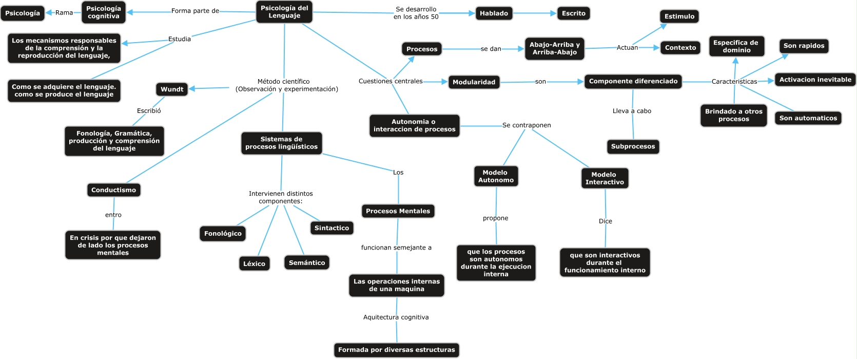 Este Cmap, tiene información relacionada con: Capitulo 11, Psicología del Lenguaje Método científico (Observación y experimentación) Wundt, Psicología del Lenguaje Estudia Los mecanismos responsables de la comprensión y la reproducción del lenguaje,, Las operaciones internas de una maquina Aquitectura cognitiva Formada por diversas estructuras, Psicología del Lenguaje Forma parte de Psicología cognitiva, Psicología del Lenguaje Se desarrollo en los años 50 Hablado, Abajo-Arriba y Arriba-Abajo Actuan Contexto, Sistemas de procesos lingüísticos Intervienen distintos componentes: S¡ntactico, Procesos Mentales funcionan semejante a Las operaciones internas de una maquina, Autonomia o interaccion de procesos Se contraponen Modelo Autonomo, Psicología del Lenguaje Se desarrollo en los años 50 Escrito, Psicología del Lenguaje Estudia Como se adquiere el lenguaje. como se produce el lenguaje, Conductismo entro En crisis por que dejaron de lado los procesos mentales, Componente diferenciado Caracteristicas Son rapidos, Psicología del Lenguaje Cuestiones centrales Autonomia o interaccion de procesos, Componente diferenciado Caracteristicas Activacion inevitable, Modularidad son Componente diferenciado, Modelo Interactivo Dice que son interactivos durante el funcionamiento interno, Psicología del Lenguaje Cuestiones centrales Modularidad, Sistemas de procesos lingüísticos Intervienen distintos componentes: Semántico, Psicología del Lenguaje Cuestiones centrales Procesos
