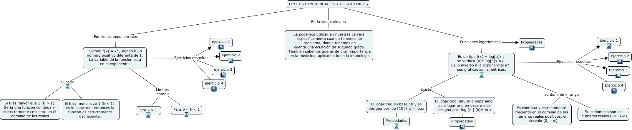 Este Cmap, tiene información relacionada con: Mapa limites exponenciales y logaritmicos, Es de tipo f(x) = log[a]x , se verifica (a)^log[a]x =x. Es lo inverso a la exponencial a*, sus graficas son simetricas. Existen El logaritmo en base 10 y se designa por log [10] ( x)= logx, Siendo f(x) = k*, siendo k un número positivo diferente de 1. La variable de la función está en el exponente. Ejercicios resueltos ejercicio 3, Siendo f(x) = k*, siendo k un número positivo diferente de 1. La variable de la función está en el exponente. Sucede Si k és menor que 1 (k < 1), es lo contrario, entonces la función es estrictamente decreciente., LIMITES EXPONENCIALES Y LOGARITMICOS Funciones logaritmicas Propiedades, Es de tipo f(x) = log[a]x , se verifica (a)^log[a]x =x. Es lo inverso a la exponencial a*, sus graficas son simetricas. Ejercicios resueltos Ejercicio 2, Es de tipo f(x) = log[a]x , se verifica (a)^log[a]x =x. Es lo inverso a la exponencial a*, sus graficas son simetricas. su dominio y rango Es continua y estrictamente creciente en el dominio de los números reales positivos, el intervalo (0, +∞), Es de tipo f(x) = log[a]x , se verifica (a)^log[a]x =x. Es lo inverso a la exponencial a*, sus graficas son simetricas. su dominio y rango Su codominio son los números reales (-∞, +∞), Siendo f(x) = k*, siendo k un número positivo diferente de 1. La variable de la función está en el exponente. Limites notable Para 0 < k < 1, El logaritmo en base 10 y se designa por log [10] ( x)= logx ???? Propiedades, Siendo f(x) = k*, siendo k un número positivo diferente de 1. La variable de la función está en el exponente. Sucede Si k és mayor que 1 (k > 1), Seria una funcion continua y esctrictamente creciente en el dominio de los reales, LIMITES EXPONENCIALES Y LOGARITMICOS Funciones logaritmicas Es de tipo f(x) = log[a]x , se verifica (a)^log[a]x =x. Es lo inverso a la exponencial a*, sus graficas son simetricas., Es de tipo f(x) = log[a]x , se verifica (a)^log[a]x =x. Es lo inverso a la exponencial a*, sus graficas son simetricas. Existen El logaritmo natural o neperiano es ellogaritmo en base e y se designa por: log [e ] (x)= ln x, Siendo f(x) = k*, siendo k un número positivo diferente de 1. La variable de la función está en el exponente. Ejercicios resueltos ejercicio 2, Es de tipo f(x) = log[a]x , se verifica (a)^log[a]x =x. Es lo inverso a la exponencial a*, sus graficas son simetricas. Ejercicios resueltos Ejercicio 4, Es de tipo f(x) = log[a]x , se verifica (a)^log[a]x =x. Es lo inverso a la exponencial a*, sus graficas son simetricas. Ejercicios resueltos Ejercicio 1, El logaritmo natural o neperiano es ellogaritmo en base e y se designa por: log [e ] (x)= ln x ???? Propiedades, Siendo f(x) = k*, siendo k un número positivo diferente de 1. La variable de la función está en el exponente. Ejercicios resueltos ejercicio 1, Es de tipo f(x) = log[a]x , se verifica (a)^log[a]x =x. Es lo inverso a la exponencial a*, sus graficas son simetricas. Ejercicios resueltos Ejercicio 3, LIMITES EXPONENCIALES Y LOGARITMICOS En la vida cotidiana La podemos utilizar,en nuestras carrera especificamente cuando tenemos un problema, donde tenemos en cuenta una ecuación de sugundo grado. Tambien sabemos que es de gran importancia en la medicina, aplicando lo en la imunologia, Siendo f(x) = k*, siendo k un número positivo diferente de 1. La variable de la función está en el exponente. Limites notable Para k > 1