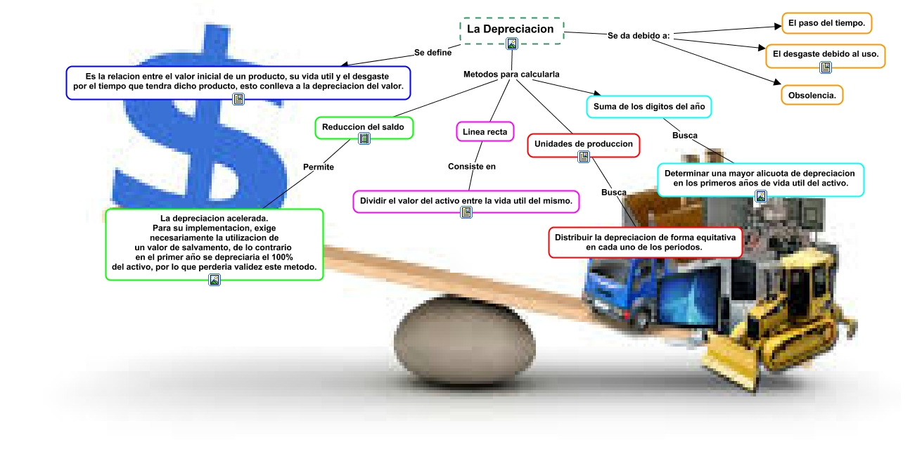 Este Cmap, tiene información relacionada con: La Depreciación, Linea recta Consiste en Dividir el valor del activo entre la vida util del mismo., Unidades de produccion Busca Distribuir la depreciacion de forma equitativa en cada uno de los periodos., La Depreciacion Metodos para calcularla Reduccion del saldo, La Depreciacion Se da debido a: Obsolencia., Reduccion del saldo Permite La depreciacion acelerada. Para su implementacion, exige necesariamente la utilizacion de un valor de salvamento, de lo contrario en el primer año se depreciaria el 100% del activo, por lo que perderia validez este metodo., La Depreciacion Se da debido a: El desgaste debido al uso., Suma de los digitos del año Busca Determinar una mayor alicuota de depreciacion en los primeros años de vida util del activo., La Depreciacion Metodos para calcularla Linea recta, La Depreciacion Metodos para calcularla Suma de los digitos del año, La Depreciacion Se define Es la relacion entre el valor inicial de un producto, su vida util y el desgaste por el tiempo que tendra dicho producto, esto conlleva a la depreciacion del valor., La Depreciacion Se da debido a: El paso del tiempo., La Depreciacion Metodos para calcularla Unidades de produccion