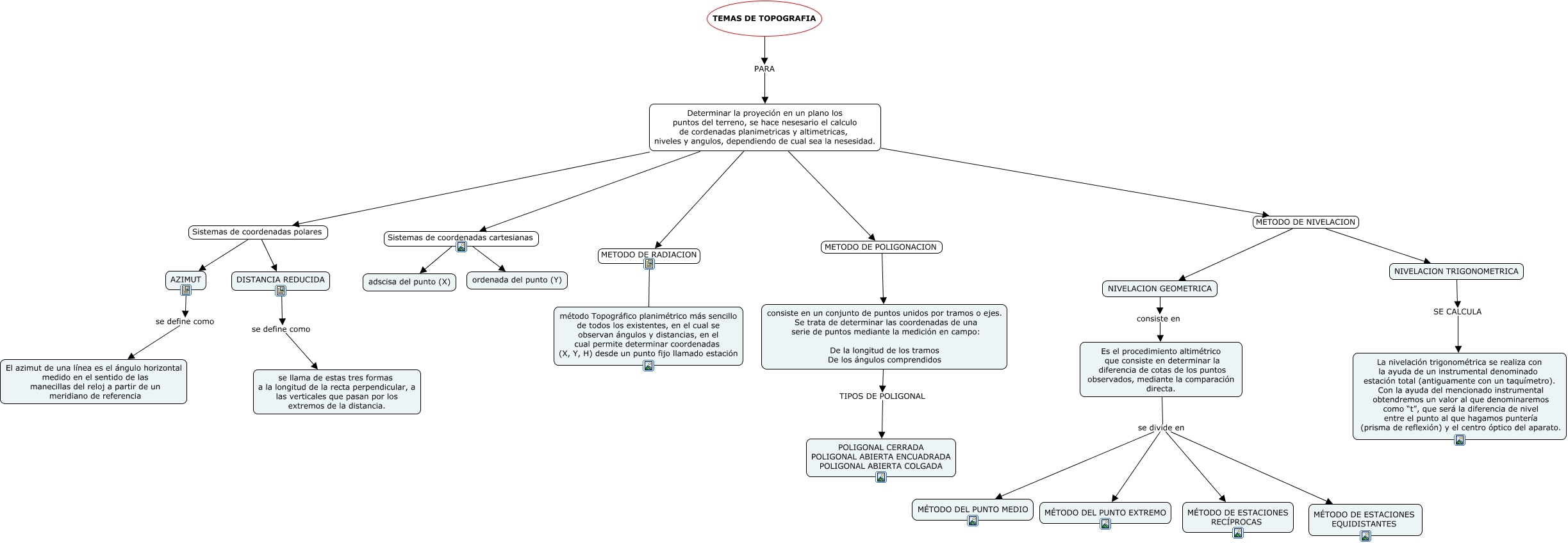 Este Cmap, tiene información relacionada con: temas de topografia, NIVELACION TRIGONOMETRICA SE CALCULA La nivelación trigonométrica se realiza con la ayuda de un instrumental denominado estación total (antiguamente con un taquímetro). Con la ayuda del mencionado instrumental obtendremos un valor al que denominaremos como “t”, que será la diferencia de nivel entre el punto al que hagamos puntería (prisma de reflexión) y el centro óptico del aparato., NIVELACION GEOMETRICA consiste en Es el procedimiento altimétrico que consiste en determinar la diferencia de cotas de los puntos observados, mediante la comparación directa., TEMAS DE TOPOGRAFIA PARA Determinar la proyeción en un plano los puntos del terreno, se hace nesesario el calculo de cordenadas planimetricas y altimetricas, niveles y angulos, dependiendo de cual sea la nesesidad., DISTANCIA REDUCIDA se define como se llama de estas tres formas a la longitud de la recta perpendicular, a las verticales que pasan por los extremos de la distancia., Determinar la proyeción en un plano los puntos del terreno, se hace nesesario el calculo de cordenadas planimetricas y altimetricas, niveles y angulos, dependiendo de cual sea la nesesidad. Sistemas de coordenadas cartesianas ordenada del punto (Y), Determinar la proyeción en un plano los puntos del terreno, se hace nesesario el calculo de cordenadas planimetricas y altimetricas, niveles y angulos, dependiendo de cual sea la nesesidad. METODO DE NIVELACION NIVELACION GEOMETRICA, Determinar la proyeción en un plano los puntos del terreno, se hace nesesario el calculo de cordenadas planimetricas y altimetricas, niveles y angulos, dependiendo de cual sea la nesesidad. Sistemas de coordenadas cartesianas adscisa del punto (X), Es el procedimiento altimétrico que consiste en determinar la diferencia de cotas de los puntos observados, mediante la comparación directa. se divide en MÉTODO DEL PUNTO EXTREMO, Determinar la proyeción en un plano los puntos del terreno, se hace nesesario el calculo de cordenadas planimetricas y altimetricas, niveles y angulos, dependiendo de cual sea la nesesidad. METODO DE POLIGONACION consiste en un conjunto de puntos unidos por tramos o ejes. Se trata de determinar las coordenadas de una serie de puntos mediante la medición en campo: De la longitud de los tramos De los ángulos comprendidos, Determinar la proyeción en un plano los puntos del terreno, se hace nesesario el calculo de cordenadas planimetricas y altimetricas, niveles y angulos, dependiendo de cual sea la nesesidad. Sistemas de coordenadas polares DISTANCIA REDUCIDA, Es el procedimiento altimétrico que consiste en determinar la diferencia de cotas de los puntos observados, mediante la comparación directa. se divide en MÉTODO DEL PUNTO MEDIO, Es el procedimiento altimétrico que consiste en determinar la diferencia de cotas de los puntos observados, mediante la comparación directa. se divide en MÉTODO DE ESTACIONES RECÍPROCAS, Determinar la proyeción en un plano los puntos del terreno, se hace nesesario el calculo de cordenadas planimetricas y altimetricas, niveles y angulos, dependiendo de cual sea la nesesidad. METODO DE RADIACION método Topográfico planimétrico más sencillo de todos los existentes, en el cual se observan ángulos y distancias, en el cual permite determinar coordenadas (X, Y, H) desde un punto fijo llamado estación, AZIMUT se define como El azimut de una línea es el ángulo horizontal medido en el sentido de las manecillas del reloj a partir de un meridiano de referencia, Determinar la proyeción en un plano los puntos del terreno, se hace nesesario el calculo de cordenadas planimetricas y altimetricas, niveles y angulos, dependiendo de cual sea la nesesidad. Sistemas de coordenadas polares AZIMUT, Determinar la proyeción en un plano los puntos del terreno, se hace nesesario el calculo de cordenadas planimetricas y altimetricas, niveles y angulos, dependiendo de cual sea la nesesidad. METODO DE NIVELACION NIVELACION TRIGONOMETRICA, Es el procedimiento altimétrico que consiste en determinar la diferencia de cotas de los puntos observados, mediante la comparación directa. se divide en MÉTODO DE ESTACIONES EQUIDISTANTES, consiste en un conjunto de puntos unidos por tramos o ejes. Se trata de determinar las coordenadas de una serie de puntos mediante la medición en campo: De la longitud de los tramos De los ángulos comprendidos TIPOS DE POLIGONAL POLIGONAL CERRADA POLIGONAL ABIERTA ENCUADRADA POLIGONAL ABIERTA COLGADA