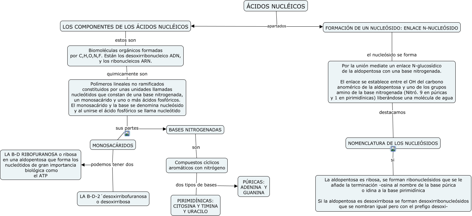 Este Cmap, tiene información relacionada con: ácidos nucléicos I, Biomoléculas orgánicos formadas por C,H,O,N,F. Están los desoxirribonucleico ADN, y los ribonucleicos ARN. quimicamente son Polímeros lineales no ramificados constituidos por unas unidades llamadas nucleótidos que constan de una base nitrogenada, un monosacárido y uno o más ácidos fosfóricos. El monosacárido y la base se denomina nucleósido y al unirse el ácido fosfórico se llama nucleótido, Por la unión mediate un enlace N-glucosídico de la aldopentosa con una base nitrogenada. El enlace se establece entre el OH del carbono anomérico de la aldopentosa y uno de los grupos amino de la base nitrogenada (Nitró. 9 en púricas y 1 en pirimidínicas) liberándose una molécula de agua destacamos NOMENCLATURA DE LOS NUCLEÓSIDOS, Polímeros lineales no ramificados constituidos por unas unidades llamadas nucleótidos que constan de una base nitrogenada, un monosacárido y uno o más ácidos fosfóricos. El monosacárido y la base se denomina nucleósido y al unirse el ácido fosfórico se llama nucleótido sus partes MONOSACÁRIDOS, Compuestos cíclicos aromáticos con nitrógeno dos tipos de bases PIRIMIDÍNICAS: CITOSINA Y TIMINA Y URACILO, FORMACIÓN DE UN NUCLEÓSIDO: ENLACE N-NUCLEÓSIDO el nucleósido se forma Por la unión mediate un enlace N-glucosídico de la aldopentosa con una base nitrogenada. El enlace se establece entre el OH del carbono anomérico de la aldopentosa y uno de los grupos amino de la base nitrogenada (Nitró. 9 en púricas y 1 en pirimidínicas) liberándose una molécula de agua, MONOSACÁRIDOS podemos tener dos LA B-D-2´desoxirribofuranosa o desoxirribosa, BASES NITROGENADAS son Compuestos cíclicos aromáticos con nitrógeno, ÁCIDOS NUCLÉICOS apartados LOS COMPONENTES DE LOS ÁCIDOS NUCLÉICOS, Compuestos cíclicos aromáticos con nitrógeno dos tipos de bases PÚRICAS: ADENINA Y GUANINA, NOMENCLATURA DE LOS NUCLEÓSIDOS si La aldopentosa es ribosa, se forman ribonucleósidos que se le añade la terminación -osina al nombre de la base púrica o idina a la base pirimidínica Si la aldopentosa es desoxirribosa se forman desoxirribonucleósidos que se nombran igual pero con el prefigo desoxi-, LOS COMPONENTES DE LOS ÁCIDOS NUCLÉICOS estos son Biomoléculas orgánicos formadas por C,H,O,N,F. Están los desoxirribonucleico ADN, y los ribonucleicos ARN., Polímeros lineales no ramificados constituidos por unas unidades llamadas nucleótidos que constan de una base nitrogenada, un monosacárido y uno o más ácidos fosfóricos. El monosacárido y la base se denomina nucleósido y al unirse el ácido fosfórico se llama nucleótido sus partes BASES NITROGENADAS, MONOSACÁRIDOS podemos tener dos LA B-D RIBOFURANOSA o ribosa en una aldopentosa que forma los nucleótidos de gran importancia biológica como el ATP, ÁCIDOS NUCLÉICOS apartados FORMACIÓN DE UN NUCLEÓSIDO: ENLACE N-NUCLEÓSIDO