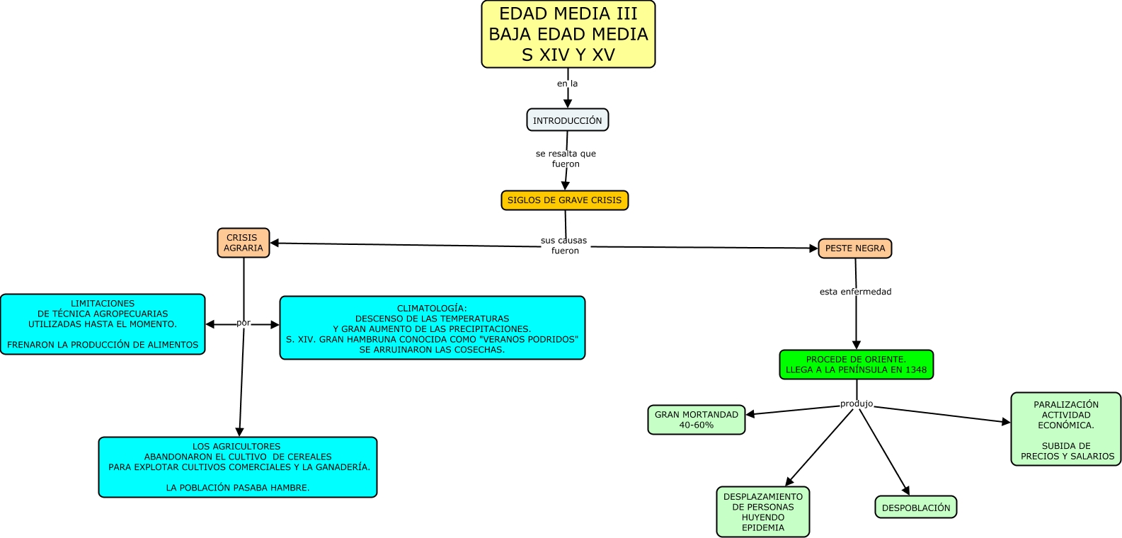 Este Cmap, tiene información relacionada con: INTRODUCCIÓN 1ENCARNI, EDAD MEDIA III BAJA EDAD MEDIA S XIV Y XV en la INTRODUCCIÓN, PROCEDE DE ORIENTE. LLEGA A LA PENÍNSULA EN 1348 produjo DESPOBLACIÓN, CRISIS AGRARIA por LOS AGRICULTORES ABANDONARON EL CULTIVO DE CEREALES PARA EXPLOTAR CULTIVOS COMERCIALES Y LA GANADERÍA. LA POBLACIÓN PASABA HAMBRE., PROCEDE DE ORIENTE. LLEGA A LA PENÍNSULA EN 1348 produjo GRAN MORTANDAD 40-60%, PESTE NEGRA esta enfermedad PROCEDE DE ORIENTE. LLEGA A LA PENÍNSULA EN 1348, CRISIS AGRARIA por LIMITACIONES DE TÉCNICA AGROPECUARIAS UTILIZADAS HASTA EL MOMENTO. FRENARON LA PRODUCCIÓN DE ALIMENTOS, CRISIS AGRARIA por CLIMATOLOGÍA: DESCENSO DE LAS TEMPERATURAS Y GRAN AUMENTO DE LAS PRECIPITACIONES. S. XIV. GRAN HAMBRUNA CONOCIDA COMO "VERANOS PODRIDOS" SE ARRUINARON LAS COSECHAS., PROCEDE DE ORIENTE. LLEGA A LA PENÍNSULA EN 1348 produjo DESPLAZAMIENTO DE PERSONAS HUYENDO EPIDEMIA, INTRODUCCIÓN se resalta que fueron SIGLOS DE GRAVE CRISIS, PROCEDE DE ORIENTE. LLEGA A LA PENÍNSULA EN 1348 produjo PARALIZACIÓN ACTIVIDAD ECONÓMICA. SUBIDA DE PRECIOS Y SALARIOS, SIGLOS DE GRAVE CRISIS sus causas fueron CRISIS AGRARIA, SIGLOS DE GRAVE CRISIS sus causas fueron PESTE NEGRA