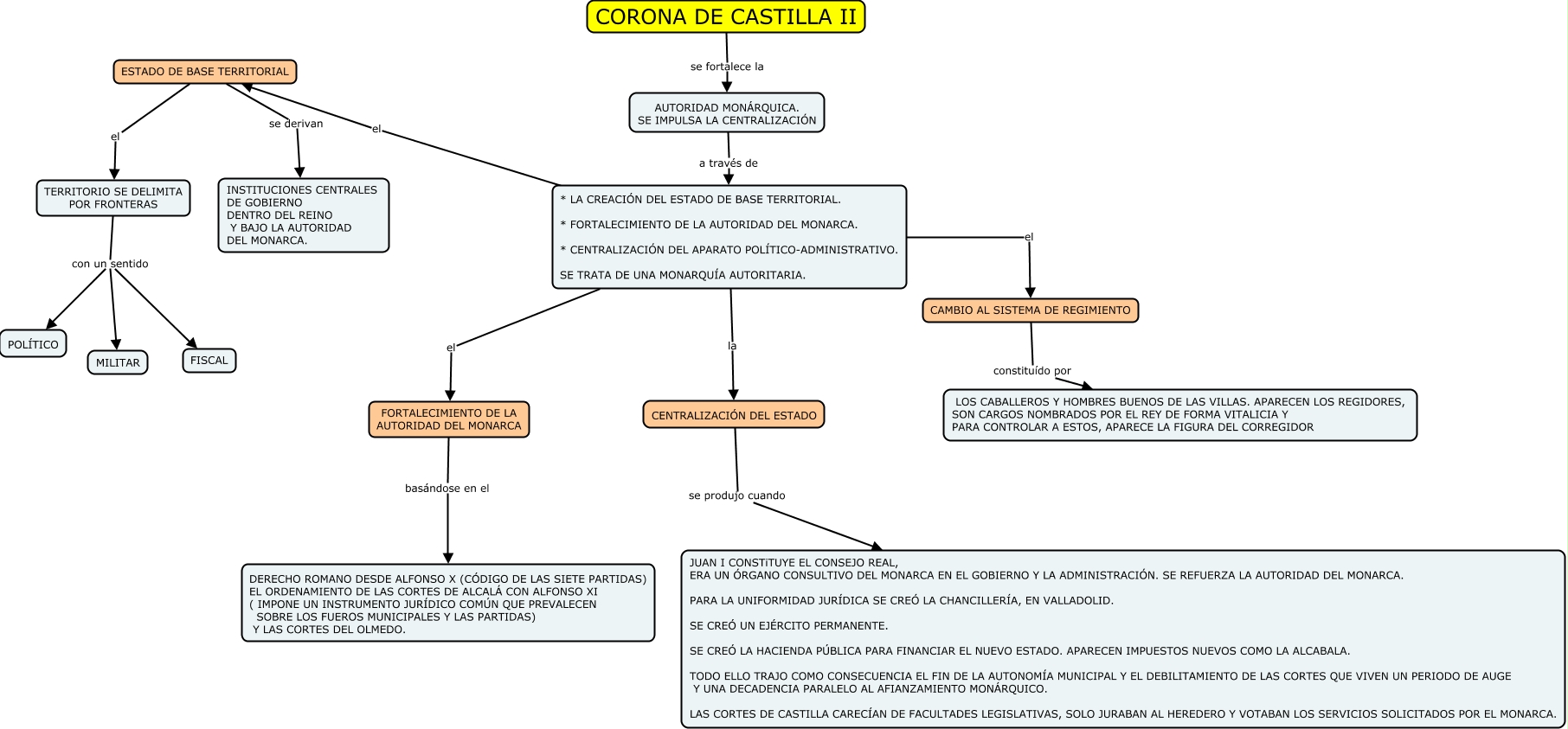 Este Cmap, tiene información relacionada con: CORONA DE CASTILLA 2 ENCARNI, TERRITORIO SE DELIMITA POR FRONTERAS con un sentido FISCAL, CAMBIO AL SISTEMA DE REGIMIENTO constituído por LOS CABALLEROS Y HOMBRES BUENOS DE LAS VILLAS. APARECEN LOS REGIDORES, SON CARGOS NOMBRADOS POR EL REY DE FORMA VITALICIA Y PARA CONTROLAR A ESTOS, APARECE LA FIGURA DEL CORREGIDOR, TERRITORIO SE DELIMITA POR FRONTERAS con un sentido POLÍTICO, CENTRALIZACIÓN DEL ESTADO se produjo cuando JUAN I CONSTiTUYE EL CONSEJO REAL, ERA UN ÓRGANO CONSULTIVO DEL MONARCA EN EL GOBIERNO Y LA ADMINISTRACIÓN. SE REFUERZA LA AUTORIDAD DEL MONARCA. PARA LA UNIFORMIDAD JURÍDICA SE CREÓ LA CHANCILLERÍA, EN VALLADOLID. SE CREÓ UN EJÉRCITO PERMANENTE. SE CREÓ LA HACIENDA PÚBLICA PARA FINANCIAR EL NUEVO ESTADO. APARECEN IMPUESTOS NUEVOS COMO LA ALCABALA. TODO ELLO TRAJO COMO CONSECUENCIA EL FIN DE LA AUTONOMÍA MUNICIPAL Y EL DEBILITAMIENTO DE LAS CORTES QUE VIVEN UN PERIODO DE AUGE Y UNA DECADENCIA PARALELO AL AFIANZAMIENTO MONÁRQUICO. LAS CORTES DE CASTILLA CARECÍAN DE FACULTADES LEGISLATIVAS, SOLO JURABAN AL HEREDERO Y VOTABAN LOS SERVICIOS SOLICITADOS POR EL MONARCA., ESTADO DE BASE TERRITORIAL se derivan INSTITUCIONES CENTRALES DE GOBIERNO DENTRO DEL REINO Y BAJO LA AUTORIDAD DEL MONARCA., FORTALECIMIENTO DE LA AUTORIDAD DEL MONARCA basándose en el DERECHO ROMANO DESDE ALFONSO X (CÓDIGO DE LAS SIETE PARTIDAS) EL ORDENAMIENTO DE LAS CORTES DE ALCALÁ CON ALFONSO XI ( IMPONE UN INSTRUMENTO JURÍDICO COMÚN QUE PREVALECEN SOBRE LOS FUEROS MUNICIPALES Y LAS PARTIDAS) Y LAS CORTES DEL OLMEDO., * LA CREACIÓN DEL ESTADO DE BASE TERRITORIAL. * FORTALECIMIENTO DE LA AUTORIDAD DEL MONARCA. * CENTRALIZACIÓN DEL APARATO POLÍTICO-ADMINISTRATIVO. SE TRATA DE UNA MONARQUÍA AUTORITARIA. el FORTALECIMIENTO DE LA AUTORIDAD DEL MONARCA, AUTORIDAD MONÁRQUICA. SE IMPULSA LA CENTRALIZACIÓN a través de * LA CREACIÓN DEL ESTADO DE BASE TERRITORIAL. * FORTALECIMIENTO DE LA AUTORIDAD DEL MONARCA. * CENTRALIZACIÓN DEL APARATO POLÍTICO-ADMINISTRATIVO. SE TRATA DE UNA MONARQUÍA AUTORITARIA., CORONA DE CASTILLA II se fortalece la AUTORIDAD MONÁRQUICA. SE IMPULSA LA CENTRALIZACIÓN, * LA CREACIÓN DEL ESTADO DE BASE TERRITORIAL. * FORTALECIMIENTO DE LA AUTORIDAD DEL MONARCA. * CENTRALIZACIÓN DEL APARATO POLÍTICO-ADMINISTRATIVO. SE TRATA DE UNA MONARQUÍA AUTORITARIA. la CENTRALIZACIÓN DEL ESTADO, * LA CREACIÓN DEL ESTADO DE BASE TERRITORIAL. * FORTALECIMIENTO DE LA AUTORIDAD DEL MONARCA. * CENTRALIZACIÓN DEL APARATO POLÍTICO-ADMINISTRATIVO. SE TRATA DE UNA MONARQUÍA AUTORITARIA. el ESTADO DE BASE TERRITORIAL, TERRITORIO SE DELIMITA POR FRONTERAS con un sentido MILITAR, * LA CREACIÓN DEL ESTADO DE BASE TERRITORIAL. * FORTALECIMIENTO DE LA AUTORIDAD DEL MONARCA. * CENTRALIZACIÓN DEL APARATO POLÍTICO-ADMINISTRATIVO. SE TRATA DE UNA MONARQUÍA AUTORITARIA. el CAMBIO AL SISTEMA DE REGIMIENTO, ESTADO DE BASE TERRITORIAL el TERRITORIO SE DELIMITA POR FRONTERAS