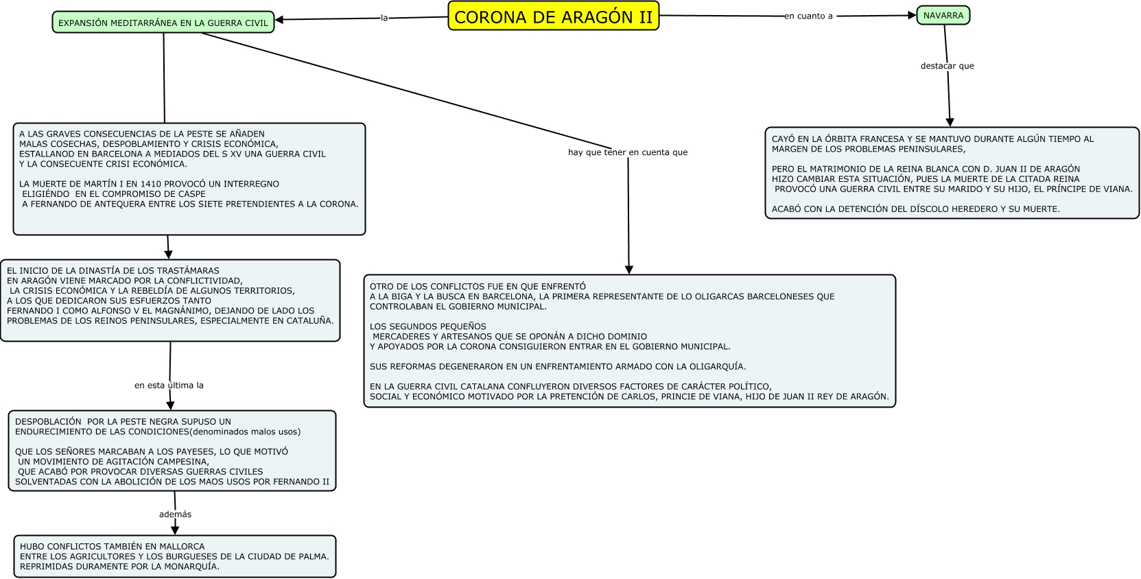 Este Cmap, tiene información relacionada con: CORONA DE ARAGÓN II ENCARNI, CORONA DE ARAGÓN II la EXPANSIÓN MEDITARRÁNEA EN LA GUERRA CIVIL, DESPOBLACIÓN POR LA PESTE NEGRA SUPUSO UN ENDURECIMIENTO DE LAS CONDICIONES(denominados malos usos) QUE LOS SEÑORES MARCABAN A LOS PAYESES, LO QUE MOTIVÓ UN MOVIMIENTO DE AGITACIÓN CAMPESINA, QUE ACABÓ POR PROVOCAR DIVERSAS GUERRAS CIVILES SOLVENTADAS CON LA ABOLICIÓN DE LOS MAOS USOS POR FERNANDO II además HUBO CONFLICTOS TAMBIÉN EN MALLORCA ENTRE LOS AGRICULTORES Y LOS BURGUESES DE LA CIUDAD DE PALMA. REPRIMIDAS DURAMENTE POR LA MONARQUÍA., CORONA DE ARAGÓN II en cuanto a NAVARRA, EXPANSIÓN MEDITARRÁNEA EN LA GUERRA CIVIL ???? A LAS GRAVES CONSECUENCIAS DE LA PESTE SE AÑADEN MALAS COSECHAS, DESPOBLAMIENTO Y CRISIS ECONÓMICA, ESTALLANOD EN BARCELONA A MEDIADOS DEL S XV UNA GUERRA CIVIL Y LA CONSECUENTE CRISI ECONÓMICA. LA MUERTE DE MARTÍN I EN 1410 PROVOCÓ UN INTERREGNO ELIGIÉNDO EN EL COMPROMISO DE CASPE A FERNANDO DE ANTEQUERA ENTRE LOS SIETE PRETENDIENTES A LA CORONA., EL INICIO DE LA DINASTÍA DE LOS TRASTÁMARAS EN ARAGÓN VIENE MARCADO POR LA CONFLICTIVIDAD, LA CRISIS ECONÓMICA Y LA REBELDÍA DE ALGUNOS TERRITORIOS, A LOS QUE DEDICARON SUS ESFUERZOS TANTO FERNANDO I COMO ALFONSO V EL MAGNÁNIMO, DEJANDO DE LADO LOS PROBLEMAS DE LOS REINOS PENINSULARES, ESPECIALMENTE EN CATALUÑA. en esta última la DESPOBLACIÓN POR LA PESTE NEGRA SUPUSO UN ENDURECIMIENTO DE LAS CONDICIONES(denominados malos usos) QUE LOS SEÑORES MARCABAN A LOS PAYESES, LO QUE MOTIVÓ UN MOVIMIENTO DE AGITACIÓN CAMPESINA, QUE ACABÓ POR PROVOCAR DIVERSAS GUERRAS CIVILES SOLVENTADAS CON LA ABOLICIÓN DE LOS MAOS USOS POR FERNANDO II, EXPANSIÓN MEDITARRÁNEA EN LA GUERRA CIVIL ???? EL INICIO DE LA DINASTÍA DE LOS TRASTÁMARAS EN ARAGÓN VIENE MARCADO POR LA CONFLICTIVIDAD, LA CRISIS ECONÓMICA Y LA REBELDÍA DE ALGUNOS TERRITORIOS, A LOS QUE DEDICARON SUS ESFUERZOS TANTO FERNANDO I COMO ALFONSO V EL MAGNÁNIMO, DEJANDO DE LADO LOS PROBLEMAS DE LOS REINOS PENINSULARES, ESPECIALMENTE EN CATALUÑA., NAVARRA destacar que CAYÓ EN LA ÓRBITA FRANCESA Y SE MANTUVO DURANTE ALGÚN TIEMPO AL MARGEN DE LOS PROBLEMAS PENINSULARES, PERO EL MATRIMONIO DE LA REINA BLANCA CON D. JUAN II DE ARAGÓN HIZO CAMBIAR ESTA SITUACIÓN, PUES LA MUERTE DE LA CITADA REINA PROVOCÓ UNA GUERRA CIVIL ENTRE SU MARIDO Y SU HIJO, EL PRÍNCIPE DE VIANA. ACABÓ CON LA DETENCIÓN DEL DÍSCOLO HEREDERO Y SU MUERTE., EXPANSIÓN MEDITARRÁNEA EN LA GUERRA CIVIL hay que tener en cuenta que OTRO DE LOS CONFLICTOS FUE EN QUE ENFRENTÓ A LA BIGA Y LA BUSCA EN BARCELONA, LA PRIMERA REPRESENTANTE DE LO OLIGARCAS BARCELONESES QUE CONTROLABAN EL GOBIERNO MUNICIPAL. LOS SEGUNDOS PEQUEÑOS MERCADERES Y ARTESANOS QUE SE OPONÁN A DICHO DOMINIO Y APOYADOS POR LA CORONA CONSIGUIERON ENTRAR EN EL GOBIERNO MUNICIPAL. SUS REFORMAS DEGENERARON EN UN ENFRENTAMIENTO ARMADO CON LA OLIGARQUÍA. EN LA GUERRA CIVIL CATALANA CONFLUYERON DIVERSOS FACTORES DE CARÁCTER POLÍTICO, SOCIAL Y ECONÓMICO MOTIVADO POR LA PRETENCIÓN DE CARLOS, PRINCIE DE VIANA, HIJO DE JUAN II REY DE ARAGÓN.
