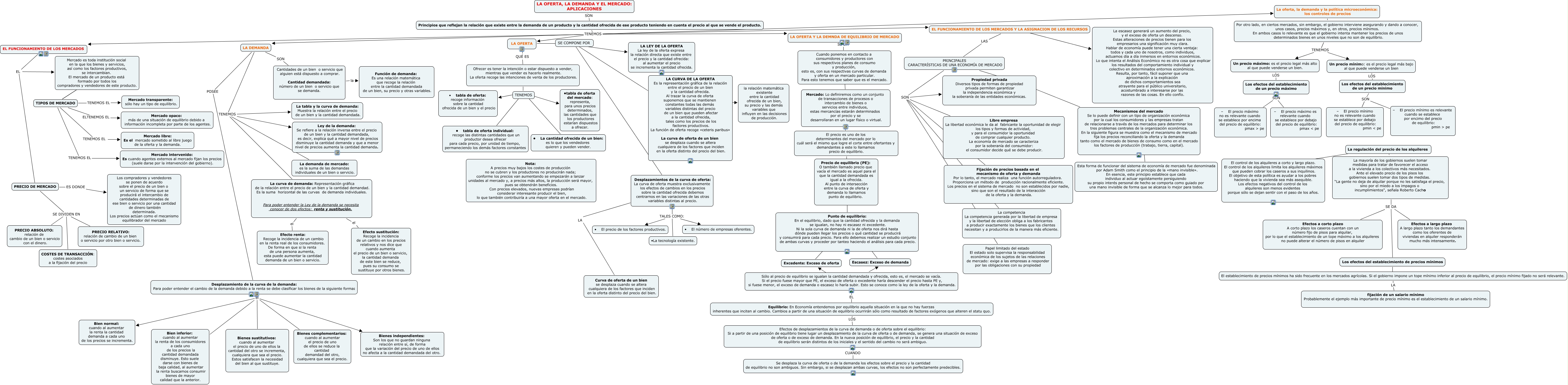 This Concept Map, created with IHMC CmapTools, has information related to: MICROECONOMIA TRABAJO 1, La curva de demanda: Representación gráfica de la relación entre el precio de un bien y la cantidad demandad. Es la suma horizontal de las curvas de demanda individuales. Para poder entender la Ley de la demanda se necesita conocer de dos efectos: renta y sustitución. el Efecto sustitución: Recoge la incidencia de un cambio en los precios relativos y nos dice que cuando aumenta el precio de un bien o servicio, la cantidad demanda de este bien se reduce, pues su consumo se sustituye por otros bienes., Principios que reflejan la relación que existe entre la demanda de un producto y la cantidad ofrecida de ese producto teniendo en cuenta el precio al que se vende el producto. TENEMOS LA DEMANDA, EL FUNCIONAMIENTO DE LOS MERCADOS Y LA ASIGNACION DE LOS RECURSOS ???? La escasez generará un aumento del precio, y el exceso de oferta un descenso. Estas alteraciones de precios tienen para los empresarios una significación muy clara. Hablar de economía puede tener una cierta ventaja: todos y cada uno de nosotros, como individuos, actuamos día a día inmersos en entornos económicos. Lo que intenta el Análisis Económico no es otra cosa que explicar los resultados del comportamiento individual y colectivo en determinados entornos económicos. Resulta, por tanto, fácil suponer que una aproximación a la explicación de dichos comportamientos sea atrayente para el público universitario, acostumbrado a interesarse por las razones de las cosas. En ello confío., Cantidades de un bien o servicio que alguien está dispuesto a comprar. Cantidad demandada: número de un bien o servicio que se demanda. la Función de demanda: Es una relación matemática que recoge la relación entre la cantidad demandada de un bien, su precio y otras variables., LA DEMANDA TENEMOS La tabla y la curva de demanda: Muestra la relación entre el precio de un bien y la cantidad demandada., Cuando ponemos en contacto a consumidores y productores con sus respectivos planes de consumo y producción, esto es, con sus respectivas curvas de demanda y oferta en un mercado particular. Para esto tenemos que saber que es el mercado. ???? Mercado: Lo definiremos como un conjunto de transacciones de procesos o intercambio de bienes o servicios entre individuos, estas mercancías estarán determinados por el precio y se desarrollaran en un lugar físico o virtual., TIPOS DE MERCADO TENEMOS EL Mercado intervenido: Es cuando agentes externos al mercado fijan los precios (suele darse por la intervención del gobierno)., Por otro lado, en ciertos mercados, sin embargo, el gobierno interviene asegurando y dando a conocer, unos casos, precios máximos y, en otros, precios mínimos. En ambos casos lo relevante es que el gobierno intenta mantener los precios de unos determinados bienes en unos niveles que no son de equilibrio. TENEMOS Un precio mínimo: es el precio legal más bajo al que puede venderse un bien, Desplazamiento de la curva de la demanda: Para poder entender el cambio de la demanda debido a la renta se debe clasificar los bienes de la siguiente forma: el Bienes sustitutivos: cuando al aumentar el precio de uno de ellos la cantidad del otro se incrementa, cualquiera que sea el precio. Estos satisfacen la necesidad del bien al que sustituye., Precio de equilibrio (PE): O también llamado precio que vacía el mercado es aquel para el que la cantidad demandada es igual a la ofrecida. Al punto de intersección entre la curva de oferta y demanda lo llamamos punto de equilibrio. ???? Punto de equilibrio: En el equilibrio, dado que la cantidad ofrecida y la demanda se igualan, no hay ni escasez ni excedente. Ni la sola curva de demanda ni la de oferta nos dirá hasta dónde pueden llegar los precios o qué cantidad se producirá y consumirá para cada precio. Para ello debemos realizar un estudio conjunto de ambas curvas y proceder por tanteo haciendo el análisis para cada precio., La mayoría de los gobiernos suelen tomar medidas para tratar de favorecer el acceso a la vivienda a los colectivos más necesitados. Ante el elevado precio de los pisos los gobiernos suelen tomar dos tipos de medidas. “La gente no deja de alquilar porque no les satisfaga el precio, sino por el miedo a los impagos o incumplimientos", señala Roberto Cacho SE DA Efectos a corto plazo A corto plazo los caseros cuentan con un número fijo de pisos para alquilar, por lo que el establecimiento de un tope máximo a los alquileres no puede alterar el número de pisos en alquiler, Un precio máximo: es el precio legal más alto al que puede venderse un bien. LOS Los efectos del establecimiento de un precio máximo, Los efectos del establecimiento de un precio minimo SON – El precio mínimo no es relevante cuando se establece por debajo del precio de equilibrio: pmin < pe, EL FUNCIONAMIENTO DE LOS MERCADOS EL Mercado es toda institución social en la que los bienes y servicios, así como los factores productivos, se intercambian. El mercado de un producto está formado por todos los compradores y vendedores de este producto., LA DEMANDA SON Cantidades de un bien o servicio que alguien está dispuesto a comprar. Cantidad demandada: número de un bien o servicio que se demanda., LA DEMANDA TENEMOS La demanda de mercado: es la suma de las demandas individuales de un bien o servicio., PRINCIPALES CARACTERÍSTICAS DE UNA ECONOMÍA DE MERCADO SON Papel limitado del estado El estado solo supervisa la responsabilidad económica de los sujetos de las relaciones de mercado: exige a las empresas a responder por las obligaciones con su propiedad, LA CURVA DE LA OFERTA Es la representación gráfica de la relación entre el precio de un bien y la cantidad ofrecida. Al trazar la curva de oferta suponemos que se mantienen constantes todas las demás variables distintas del precio de un bien que pueden afectar a la cantidad ofrecida, tales como los precios de los factores 