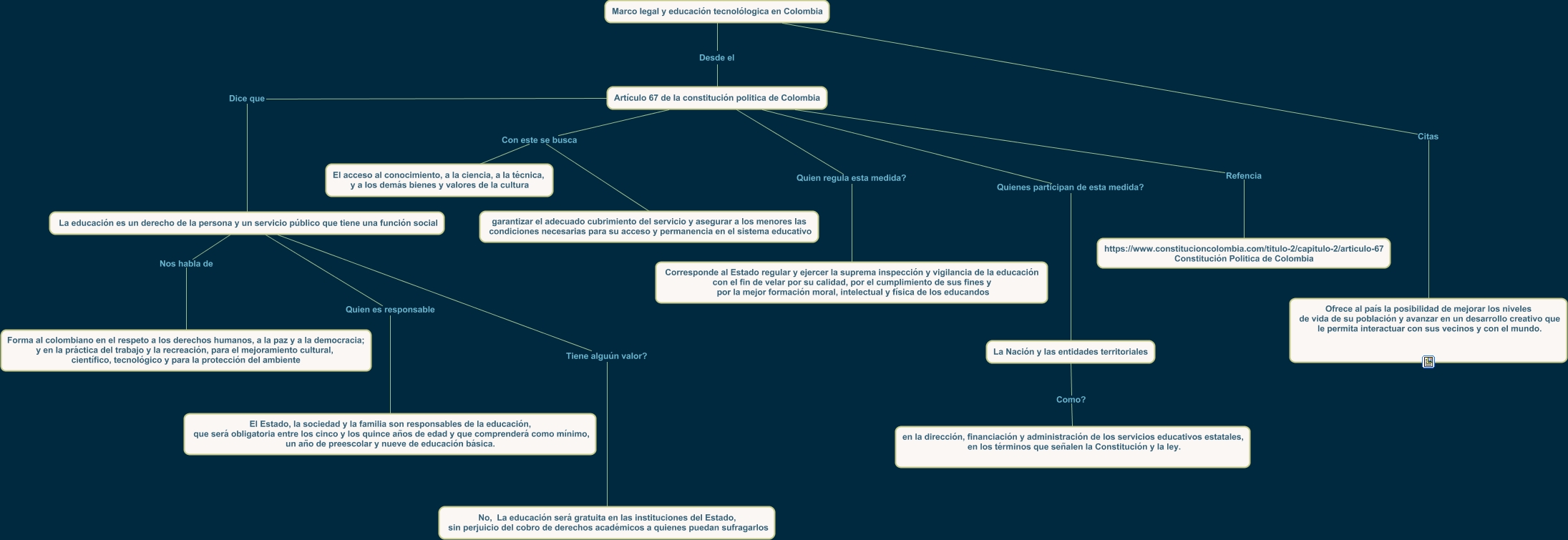 Este Cmap, tiene información relacionada con: Marco legal y educacion tecnologica en colombia, Artículo 67 de la constitución politica de Colombia Dice que La educación es un derecho de la persona y un servicio público que tiene una función social, Marco legal y educación tecnolólogica en Colombia Citas Ofrece al país la posibilidad de mejorar los niveles de vida de su población y avanzar en un desarrollo creativo que le permita interactuar con sus vecinos y con el mundo., Artículo 67 de la constitución politica de Colombia Refencia https://www.constitucioncolombia.com/titulo-2/capitulo-2/articulo-67 Constitución Politica de Colombia, La educación es un derecho de la persona y un servicio público que tiene una función social Quien es responsable El Estado, la sociedad y la familia son responsables de la educación, que será obligatoria entre los cinco y los quince años de edad y que comprenderá como mínimo, un año de preescolar y nueve de educación básica., Marco legal y educación tecnolólogica en Colombia Desde el Artículo 67 de la constitución politica de Colombia, Artículo 67 de la constitución politica de Colombia Con este se busca El acceso al conocimiento, a la ciencia, a la técnica, y a los demás bienes y valores de la cultura, La Nación y las entidades territoriales Como? en la dirección, financiación y administración de los servicios educativos estatales, en los términos que señalen la Constitución y la ley., Artículo 67 de la constitución politica de Colombia Con este se busca garantizar el adecuado cubrimiento del servicio y asegurar a los menores las condiciones necesarias para su acceso y permanencia en el sistema educativo, Artículo 67 de la constitución politica de Colombia Quien regula esta medida? Corresponde al Estado regular y ejercer la suprema inspección y vigilancia de la educación con el fin de velar por su calidad, por el cumplimiento de sus fines y por la mejor formación moral, intelectual y física de los educandos, La educación es un derecho de la persona y un servicio público que tiene una función social Tiene alguún valor? No, La educación será gratuita en las instituciones del Estado, sin perjuicio del cobro de derechos académicos a quienes puedan sufragarlos, Artículo 67 de la constitución politica de Colombia Quienes participan de esta medida? La Nación y las entidades territoriales, La educación es un derecho de la persona y un servicio público que tiene una función social Nos habla de Forma al colombiano en el respeto a los derechos humanos, a la paz y a la democracia; y en la práctica del trabajo y la recreación, para el mejoramiento cultural, científico, tecnológico y para la protección del ambiente