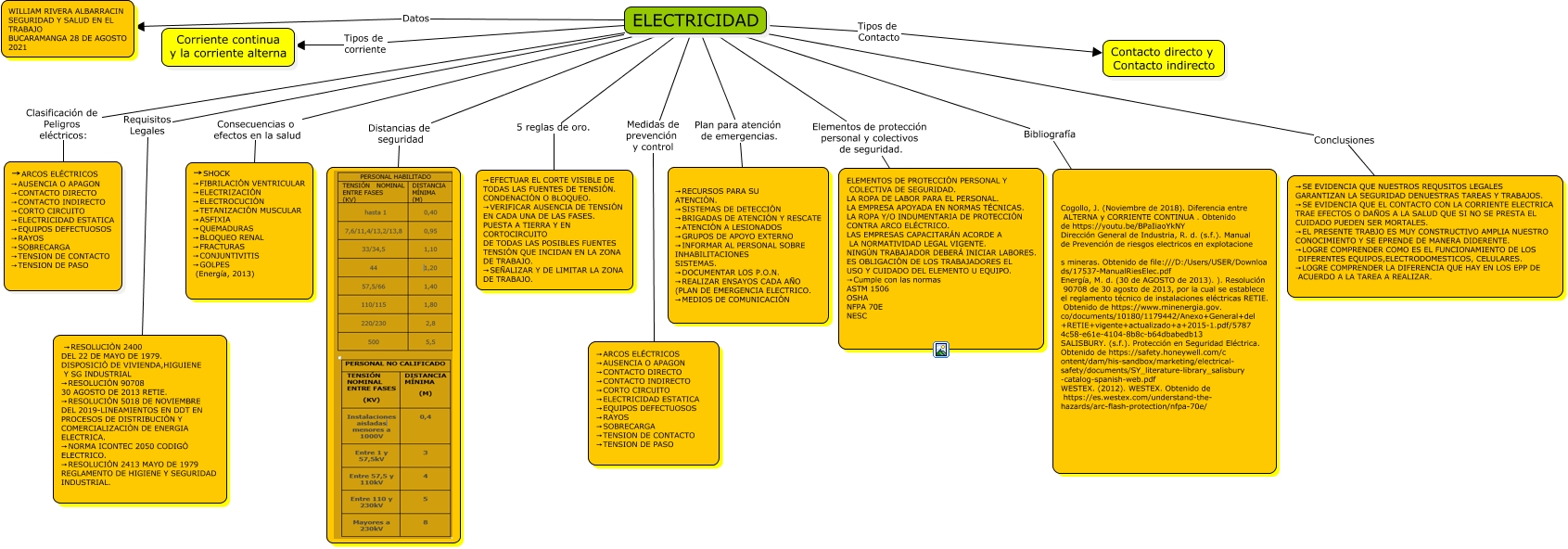Este Cmap, tiene información relacionada con: MAPA MENTAL SOBRE EL PELIGRO ELÉCTRICO, ELECTRICIDAD Bibliografía Cogollo, J. (Noviembre de 2018). Diferencia entre ALTERNA y CORRIENTE CONTINUA . Obtenido de https://youtu.be/BPaIiaoYkNY Dirección General de Industria, R. d. (s.f.). Manual de Prevención de riesgos electricos en explotacione s mineras. Obtenido de file:///D:/Users/USER/Downloa ds/17537-ManualRiesElec.pdf Energía, M. d. (30 de AGOSTO de 2013). ). Resolución 90708 de 30 agosto de 2013, por la cual se establece el reglamento técnico de instalaciones eléctricas RETIE. Obtenido de https://www.minenergia.gov. co/documents/10180/1179442/Anexo+General+del +RETIE+vigente+actualizado+a+2015-1.pdf/5787 4c58-e61e-4104-8b8c-b64dbabedb13 SALISBURY. (s.f.). Protección en Seguridad Eléctrica. Obtenido de https://safety.honeywell.com/c ontent/dam/his-sandbox/marketing/electrical- safety/documents/SY_literature-library_salisbury -catalog-spanish-web.pdf WESTEX. (2012). WESTEX. Obtenido de https://es.westex.com/understand-the- hazards/arc-flash-protection/nfpa-70e/, ELECTRICIDAD Conclusiones →SE EVIDENCIA QUE NUESTROS REQUSITOS LEGALES GARANTIZAN LA SEGURIDAD DENUESTRAS TAREAS Y TRABAJOS. →SE EVIDENCIA QUE EL CONTACTO CON LA CORRIENTE ELECTRICA TRAE EFECTOS O DAÑOS A LA SALUD QUE SI NO SE PRESTA EL CUIDADO PUEDEN SER MORTALES. →EL PRESENTE TRABJO ES MUY CONSTRUCTIVO AMPLIA NUESTRO CONOCIMIENTO Y SE EPRENDE DE MANERA DIDERENTE. →LOGRE COMPRENDER COMO ES EL FUNCIONAMIENTO DE LOS DIFERENTES EQUIPOS,ELECTRODOMESTICOS, CELULARES. →LOGRE COMPRENDER LA DIFERENCIA QUE HAY EN LOS EPP DE ACUERDO A LA TAREA A REALIZAR., ELECTRICIDAD Consecuencias o efectos en la salud →SHOCK →FIBRILACIÓN VENTRICULAR →ELECTRIZACIÓN →ELECTROCUCIÓN →TETANIZACIÓN MUSCULAR →ASFIXIA →QUEMADURAS →BLOQUEO RENAL →FRACTURAS →CONJUNTIVITIS →GOLPES (Energía, 2013), ELECTRICIDAD Tipos de Contacto Contacto directo y Contacto indirecto, ELECTRICIDAD Distancias de seguridad, ELECTRICIDAD Tipos de corriente Corriente continua y la corriente alterna, ELECTRICIDAD Clasificación de Peligros eléctricos: →ARCOS ELÉCTRICOS →AUSENCIA O APAGON →CONTACTO DIRECTO →CONTACTO INDIRECTO →CORTO CIRCUITO →ELECTRICIDAD ESTATICA →EQUIPOS DEFECTUOSOS →RAYOS →SOBRECARGA →TENSION DE CONTACTO →TENSION DE PASO, ELECTRICIDAD Elementos de protección personal y colectivos de seguridad. ELEMENTOS DE PROTECCIÓN PERSONAL Y COLECTIVA DE SEGURIDAD. LA ROPA DE LABOR PARA EL PERSONAL. LA EMPRESA APOYADA EN NORMAS TÉCNICAS. LA ROPA Y/O INDUMENTARIA DE PROTECCIÓN CONTRA ARCO ELÉCTRICO. LAS EMPRESAS CAPACITARÁN ACORDE A LA NORMATIVIDAD LEGAL VIGENTE. NINGÚN TRABAJADOR DEBERÁ INICIAR LABORES. ES OBLIGACIÓN DE LOS TRABAJADORES EL USO Y CUIDADO DEL ELEMENTO U EQUIPO. →Cumple con las normas ASTM 1506 OSHA NFPA 70E NESC, ELECTRICIDAD Requisitos Legales →RESOLUCIÒN 2400 DEL 22 DE MAYO DE 1979. DISPOSICIÒ DE VIVIENDA,HIGUIENE Y SG INDUSTRIAL →RESOLUCIÒN 90708 30 AGOSTO DE 2013 RETIE. →RESOLUCIÒN 5018 DE NOVIEMBRE DEL 2019-LINEAMIENTOS EN DDT EN PROCESOS DE DISTRIBUCIÒN Y COMERCIALIZACIÒN DE ENERGIA ELECTRICA. →NORMA ICONTEC 2050 CODIGÒ ELECTRICO. →RESOLUCIÒN 2413 MAYO DE 1979 REGLAMENTO DE HIGIENE Y SEGURIDAD INDUSTRIAL., ELECTRICIDAD 5 reglas de oro. →EFECTUAR EL CORTE VISIBLE DE TODAS LAS FUENTES DE TENSIÓN. CONDENACIÓN O BLOQUEO. →VERIFICAR AUSENCIA DE TENSIÓN EN CADA UNA DE LAS FASES. PUESTA A TIERRA Y EN CORTOCIRCUITO DE TODAS LAS POSIBLES FUENTES TENSIÓN QUE INCIDAN EN LA ZONA DE TRABAJO. →SEÑALIZAR Y DE LIMITAR LA ZONA DE TRABAJO., ELECTRICIDAD Medidas de prevención y control →ARCOS ELÉCTRICOS →AUSENCIA O APAGON →CONTACTO DIRECTO →CONTACTO INDIRECTO →CORTO CIRCUITO →ELECTRICIDAD ESTATICA →EQUIPOS DEFECTUOSOS →RAYOS →SOBRECARGA →TENSION DE CONTACTO →TENSION DE PASO, ELECTRICIDAD Datos WILLIAM RIVERA ALBARRACIN SEGURIDAD Y SALUD EN EL TRABAJO BUCARAMANGA 28 DE AGOSTO 2021, ELECTRICIDAD Plan para atención de emergencias. →RECURSOS PARA SU ATENCIÓN. →SISTEMAS DE DETECCIÓN →BRIGADAS DE ATENCIÓN Y RESCATE →ATENCIÓN A LESIONADOS →GRUPOS DE APOYO EXTERNO →INFORMAR AL PERSONAL SOBRE INHABILITACIONES SISTEMAS. →DOCUMENTAR LOS P.O.N. →REALIZAR ENSAYOS CADA AÑO (PLAN DE EMERGENCIA ELECTRICO. →MEDIOS DE COMUNICACIÓN