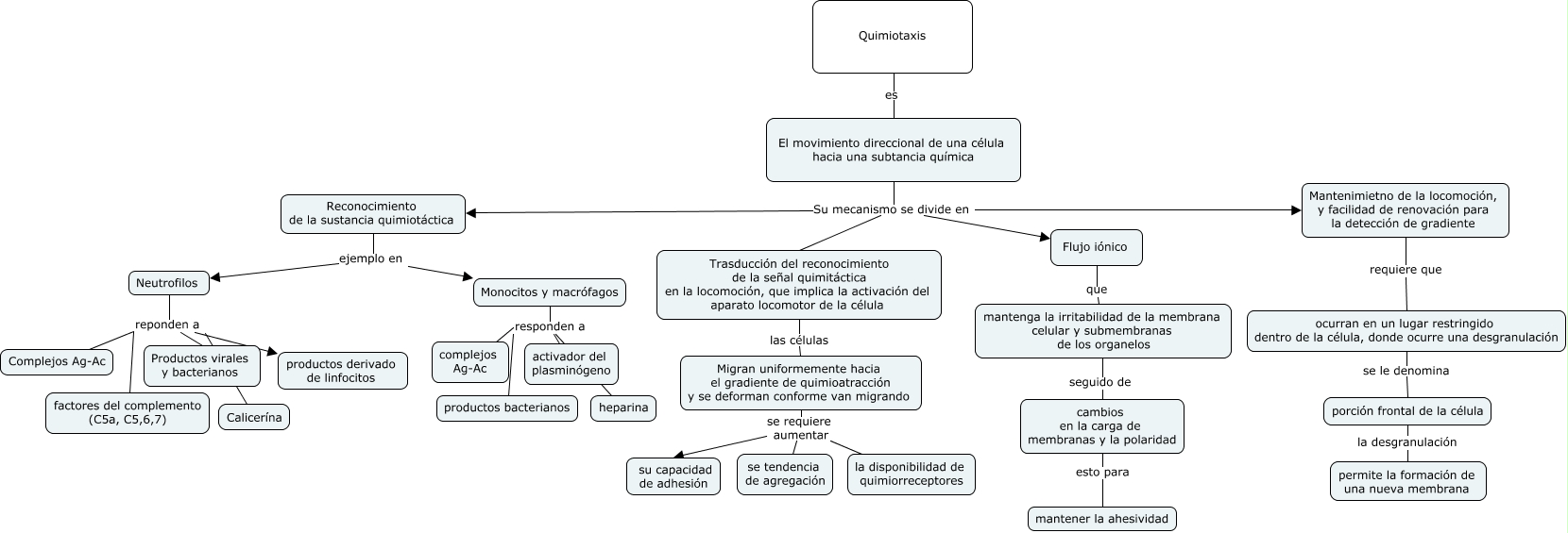 Este Cmap, tiene información relacionada con: mapa quimiotaxis, El movimiento direccional de una célula hacia una subtancia química Su mecanismo se divide en Trasducción del reconocimiento de la señal quimitáctica en la locomoción, que implica la activación del aparato locomotor de la célula, El movimiento direccional de una célula hacia una subtancia química Su mecanismo se divide en Flujo iónico, mantenga la irritabilidad de la membrana celular y submembranas de los organelos seguido de cambios en la carga de membranas y la polaridad, porción frontal de la célula la desgranulación permite la formación de una nueva membrana, Reconocimiento de la sustancia quimiotáctica ejemplo en Neutrofilos, Flujo iónico que mantenga la irritabilidad de la membrana celular y submembranas de los organelos, Neutrofilos reponden a Productos virales y bacterianos, Reconocimiento de la sustancia quimiotáctica ejemplo en Monocitos y macrófagos, Neutrofilos reponden a Complejos Ag-Ac, Quimiotaxis es El movimiento direccional de una célula hacia una subtancia química, Monocitos y macrófagos responden a activador del plasminógeno, cambios en la carga de membranas y la polaridad esto para mantener la ahesividad, El movimiento direccional de una célula hacia una subtancia química Su mecanismo se divide en Mantenimietno de la locomoción, y facilidad de renovación para la detección de gradiente, Migran uniformemente hacia el gradiente de quimioatracción y se deforman conforme van migrando se requiere aumentar se tendencia de agregación, Trasducción del reconocimiento de la señal quimitáctica en la locomoción, que implica la activación del aparato locomotor de la célula las células Migran uniformemente hacia el gradiente de quimioatracción y se deforman conforme van migrando, Neutrofilos reponden a factores del complemento (C5a, C5,6,7), Neutrofilos reponden a productos derivado de linfocitos, Migran uniformemente hacia el gradiente de quimioatracción y se deforman conforme van migrando se requiere aumentar su capacidad de adhesión, Monocitos y macrófagos responden a heparina, Monocitos y macrófagos responden a productos bacterianos