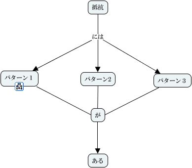 このコンセプトマップに関連する情報: 抵抗, パターン1 ???? ある, 抵抗 には パターン3, 抵抗 には パターン1, パターン2 ???? ある, 抵抗 には パターン2, パターン3 ???? ある