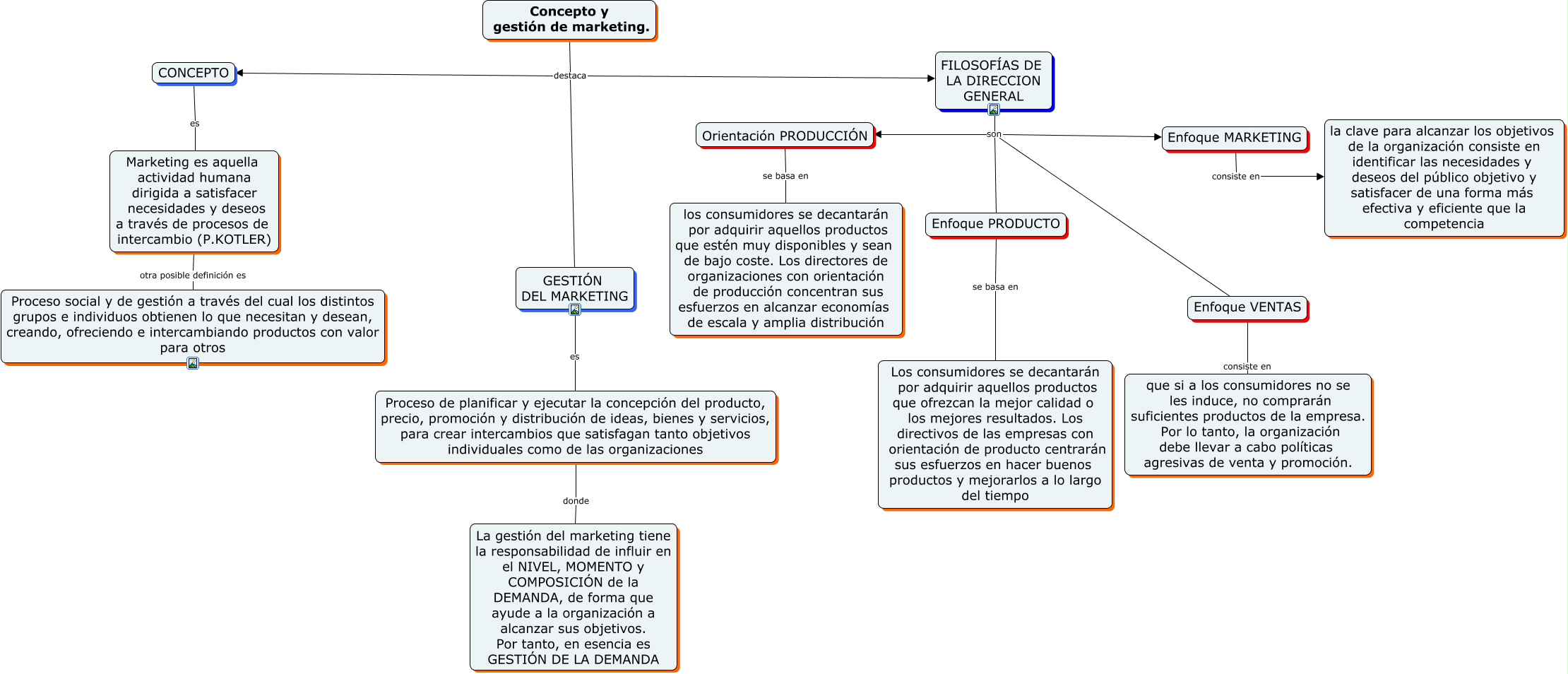 Este Cmap, tiene información relacionada con: concepto de gestión y marketing, FILOSOFÍAS DE LA DIRECCION GENERAL son Enfoque VENTAS, FILOSOFÍAS DE LA DIRECCION GENERAL son Orientación PRODUCCIÓN, Orientación PRODUCCIÓN se basa en los consumidores se decantarán por adquirir aquellos productos que estén muy disponibles y sean de bajo coste. Los directores de organizaciones con orientación de producción concentran sus esfuerzos en alcanzar economías de escala y amplia distribución, FILOSOFÍAS DE LA DIRECCION GENERAL son Enfoque MARKETING, Concepto y gestión de marketing. destaca GESTIÓN DEL MARKETING, GESTIÓN DEL MARKETING es Proceso de planificar y ejecutar la concepción del producto, precio, promoción y distribución de ideas, bienes y servicios, para crear intercambios que satisfagan tanto objetivos individuales como de las organizaciones, CONCEPTO es Marketing es aquella actividad humana dirigida a satisfacer necesidades y deseos a través de procesos de intercambio (P.KOTLER), FILOSOFÍAS DE LA DIRECCION GENERAL son Enfoque PRODUCTO, Concepto y gestión de marketing. destaca FILOSOFÍAS DE LA DIRECCION GENERAL, Enfoque MARKETING consiste en la clave para alcanzar los objetivos de la organización consiste en identificar las necesidades y deseos del público objetivo y satisfacer de una forma más efectiva y eficiente que la competencia, Concepto y gestión de marketing. destaca CONCEPTO, Enfoque PRODUCTO se basa en Los consumidores se decantarán por adquirir aquellos productos que ofrezcan la mejor calidad o los mejores resultados. Los directivos de las empresas con orientación de producto centrarán sus esfuerzos en hacer buenos productos y mejorarlos a lo largo del tiempo, Enfoque VENTAS consiste en que si a los consumidores no se les induce, no comprarán suficientes productos de la empresa. Por lo tanto, la organización debe llevar a cabo políticas agresivas de venta y promoción., Marketing es aquella actividad humana dirigida a satisfacer necesidades y deseos a través de procesos de intercambio (P.KOTLER) otra posible definición es Proceso social y de gestión a través del cual los distintos grupos e individuos obtienen lo que necesitan y desean, creando, ofreciendo e intercambiando productos con valor para otros, Proceso de planificar y ejecutar la concepción del producto, precio, promoción y distribución de ideas, bienes y servicios, para crear intercambios que satisfagan tanto objetivos individuales como de las organizaciones donde La gestión del marketing tiene la responsabilidad de influir en el NIVEL, MOMENTO y COMPOSICIÓN de la DEMANDA, de forma que ayude a la organización a alcanzar sus objetivos. Por tanto, en esencia es GESTIÓN DE LA DEMANDA