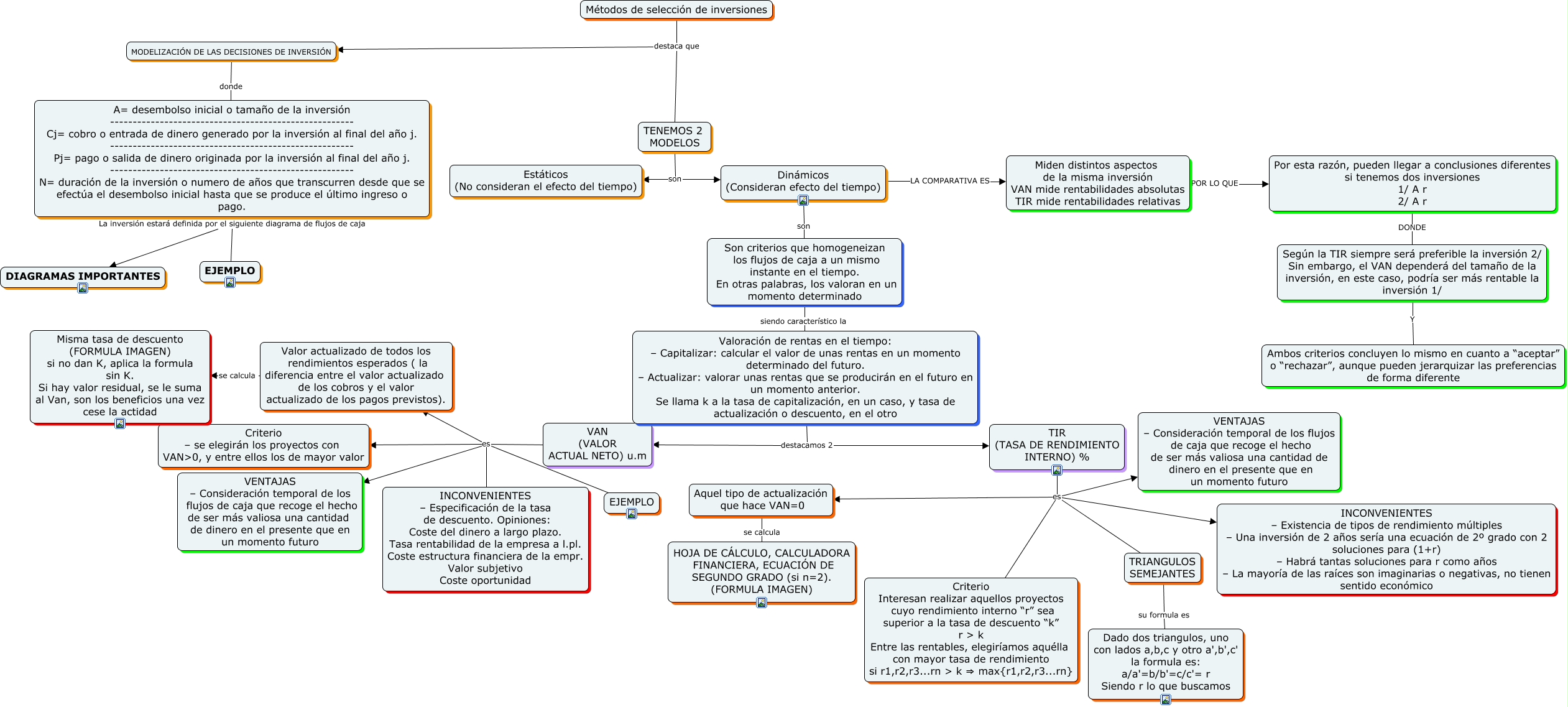 Este Cmap, tiene información relacionada con: METODOS DINAMICOS, VAN (VALOR ACTUAL NETO) u.m es EJEMPLO, TENEMOS 2 MODELOS son Dinámicos (Consideran efecto del tiempo), MODELIZACIÓN DE LAS DECISIONES DE INVERSIÓN donde A= desembolso inicial o tamaño de la inversión ------------------------------------------------------ Cj= cobro o entrada de dinero generado por la inversión al final del año j. ------------------------------------------------------ Pj= pago o salida de dinero originada por la inversión al final del año j. ------------------------------------------------------ N= duración de la inversión o numero de años que transcurren desde que se efectúa el desembolso inicial hasta que se produce el último ingreso o pago., TIR (TASA DE RENDIMIENTO INTERNO) % es TRIANGULOS SEMEJANTES, TIR (TASA DE RENDIMIENTO INTERNO) % es Criterio Interesan realizar aquellos proyectos cuyo rendimiento interno “r” sea superior a la tasa de descuento “k” r > k Entre las rentables, elegiríamos aquélla con mayor tasa de rendimiento si r1,r2,r3...rn > k ⇒ max{r1,r2,r3...rn}, Dinámicos (Consideran efecto del tiempo) son Son criterios que homogeneizan los flujos de caja a un mismo instante en el tiempo. En otras palabras, los valoran en un momento determinado, Métodos de selección de inversiones destaca que MODELIZACIÓN DE LAS DECISIONES DE INVERSIÓN, Son criterios que homogeneizan los flujos de caja a un mismo instante en el tiempo. En otras palabras, los valoran en un momento determinado siendo característico la Valoración de rentas en el tiempo: – Capitalizar: calcular el valor de unas rentas en un momento determinado del futuro. – Actualizar: valorar unas rentas que se producirán en el futuro en un momento anterior. Se llama k a la tasa de capitalización, en un caso, y tasa de actualización o descuento, en el otro, TIR (TASA DE RENDIMIENTO INTERNO) % es Aquel tipo de actualización que hace VAN=0, VAN (VALOR ACTUAL NETO) u.m es INCONVENIENTES – Especificación de la tasa de descuento. Opiniones: Coste del dinero a largo plazo. Tasa rentabilidad de la empresa a l.pl. Coste estructura financiera de la empr. Valor subjetivo Coste oportunidad, VAN (VALOR ACTUAL NETO) u.m es VENTAJAS – Consideración temporal de los flujos de caja que recoge el hecho de ser más valiosa una cantidad de dinero en el presente que en un momento futuro, TENEMOS 2 MODELOS son Estáticos (No consideran el efecto del tiempo), VAN (VALOR ACTUAL NETO) u.m es Valor actualizado de todos los rendimientos esperados ( la diferencia entre el valor actualizado de los cobros y el valor actualizado de los pagos previstos)., Valor actualizado de todos los rendimientos esperados ( la diferencia entre el valor actualizado de los cobros y el valor actualizado de los pagos previstos). se calcula Misma tasa de descuento (FORMULA IMAGEN) si no dan K, aplica la formula sin K. Si hay valor residual, se le suma al Van, son los beneficios una vez cese la actidad, TIR (TASA DE RENDIMIENTO INTERNO) % es VENTAJAS – Consideración temporal de los flujos de caja que recoge el hecho de ser más valiosa una cantidad de dinero en el presente que en un momento futuro, VAN (VALOR ACTUAL NETO) u.m es Criterio – se elegirán los proyectos con VANɬ, y entre ellos los de mayor valor, Valoración de rentas en el tiempo: – Capitalizar: calcular el valor de unas rentas en un momento determinado del futuro. – Actualizar: valorar unas rentas que se producirán en el futuro en un momento anterior. Se llama k a la tasa de capitalización, en un caso, y tasa de actualización o descuento, en el otro destacamos 2 TIR (TASA DE RENDIMIENTO INTERNO) %, Dinámicos (Consideran efecto del tiempo) LA COMPARATIVA ES Miden distintos aspectos de la misma inversión VAN mide rentabilidades absolutas TIR mide rentabilidades relativas, Valoración de rentas en el tiempo: – Capitalizar: calcular el valor de unas rentas en un momento determinado del futuro. – Actualizar: valorar unas rentas que se producirán en el futuro en un momento anterior. Se llama k a la tasa de capitalización, en un caso, y tasa de actualización o descuento, en el otro destacamos 2 VAN (VALOR ACTUAL NETO) u.m, Por esta razón, pueden llegar a conclusiones diferentes si tenemos dos inversiones 1/ A r 2/ A r DONDE Según la TIR siempre será preferible la inversión 2/ Sin embargo, el VAN dependerá del tamaño de la inversión, en este caso, podría ser más rentable la inversión 1/