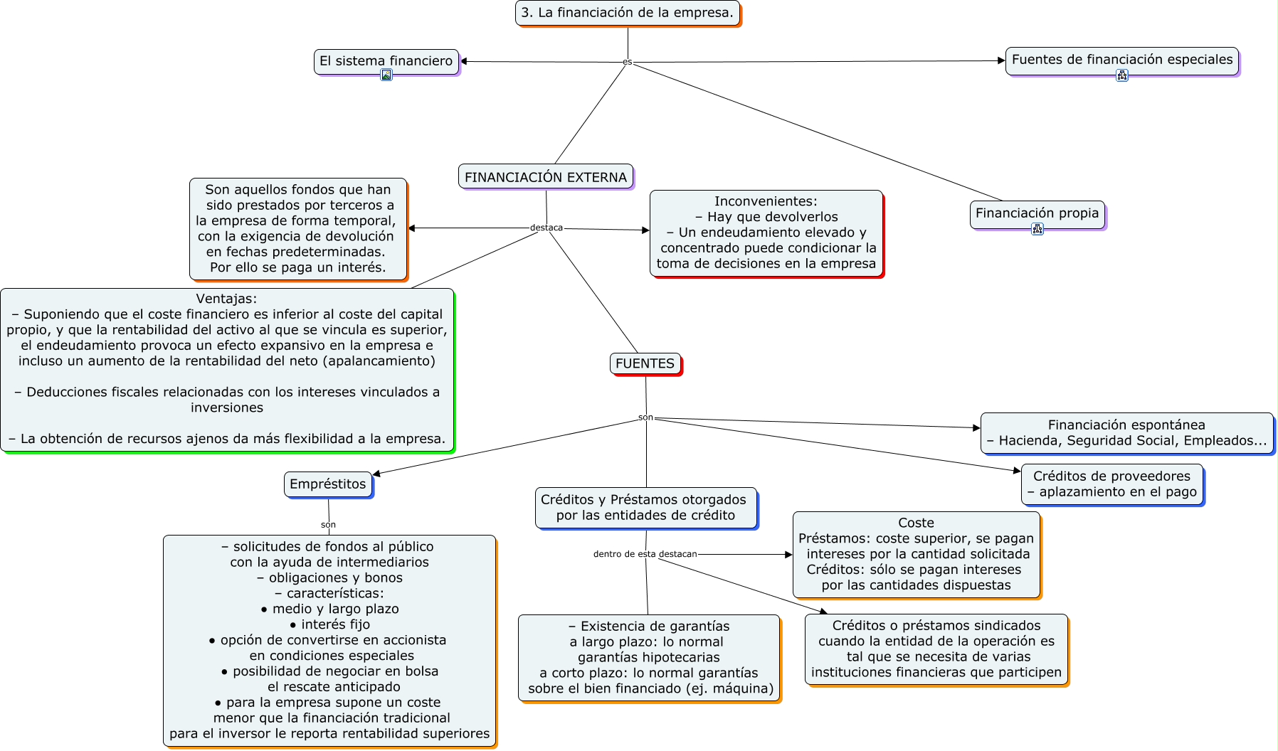 Este Cmap, tiene información relacionada con: financiación de la empresa, FINANCIACIÓN EXTERNA destaca Ventajas: – Suponiendo que el coste financiero es inferior al coste del capital propio, y que la rentabilidad del activo al que se vincula es superior, el endeudamiento provoca un efecto expansivo en la empresa e incluso un aumento de la rentabilidad del neto (apalancamiento) – Deducciones fiscales relacionadas con los intereses vinculados a inversiones – La obtención de recursos ajenos da más flexibilidad a la empresa., FINANCIACIÓN EXTERNA destaca Son aquellos fondos que han sido prestados por terceros a la empresa de forma temporal, con la exigencia de devolución en fechas predeterminadas. Por ello se paga un interés., 3. La financiación de la empresa. es Fuentes de financiación especiales, FUENTES son Créditos de proveedores – aplazamiento en el pago, FINANCIACIÓN EXTERNA destaca Inconvenientes: – Hay que devolverlos – Un endeudamiento elevado y concentrado puede condicionar la toma de decisiones en la empresa, FINANCIACIÓN EXTERNA destaca FUENTES, FUENTES son Financiación espontánea – Hacienda, Seguridad Social, Empleados..., FUENTES son Empréstitos, Empréstitos son – solicitudes de fondos al público con la ayuda de intermediarios – obligaciones y bonos – características: ∙ medio y largo plazo ∙ interés fijo ∙ opción de convertirse en accionista en condiciones especiales ∙ posibilidad de negociar en bolsa el rescate anticipado ∙ para la empresa supone un coste menor que la financiación tradicional para el inversor le reporta rentabilidad superiores, FUENTES son Créditos y Préstamos otorgados por las entidades de crédito, 3. La financiación de la empresa. es Financiación propia, 3. La financiación de la empresa. es El sistema financiero, Créditos y Préstamos otorgados por las entidades de crédito dentro de esta destacan – Existencia de garantías a largo plazo: lo normal garantías hipotecarias a corto plazo: lo normal garantías sobre el bien financiado (ej. máquina), Créditos y Préstamos otorgados por las entidades de crédito dentro de esta destacan Créditos o préstamos sindicados cuando la entidad de la operación es tal que se necesita de varias instituciones financieras que participen, Créditos y Préstamos otorgados por las entidades de crédito dentro de esta destacan Coste Préstamos: coste superior, se pagan intereses por la cantidad solicitada Créditos: sólo se pagan intereses por las cantidades dispuestas, 3. La financiación de la empresa. es FINANCIACIÓN EXTERNA
