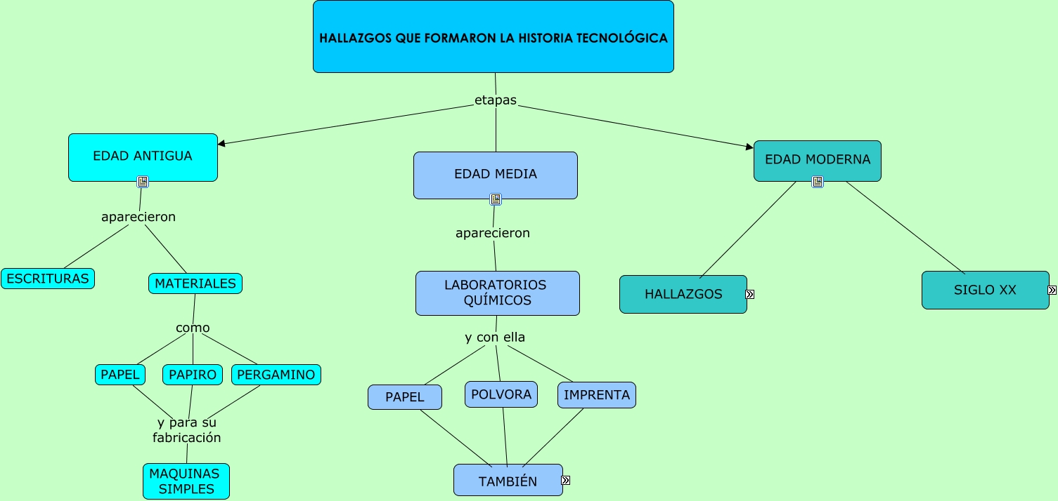 Este Cmap, tiene información relacionada con: MAPA 3 HALLAZGOS QUE FORMARON LA HISTORIA TECNOLÓGICA, PERGAMINO y para su fabricación MAQUINAS SIMPLES, EDAD MODERNA a partir del siglo XX CELULARES, PAPEL también MOLINO DE VIENTO, EDAD MODERNA a partir del siglo XX TELÉFONOS, POLVORA también MOLINO DE VIENTO, PAPEL también RUECA PARA HILAR, EDAD MODERNA aparecieron MÁQUINA FOTOGRAFICA, IMPRENTA también BRÚJULA, POLVORA también MOLINO HIDRAULICO, IMPRENTA también MÁQUINAS COMPLEJAS, EDAD MODERNA a partir del siglo XX RADIO, EDAD MEDIA aparecieron LABORATORIOS QUÍMICOS, POLVORA también MÁQUINAS COMPLEJAS, EDAD MODERNA a partir del siglo XX ORDENADORES, HALLAZGOS QUE FORMARON LA HISTORIA TECNOLÓGICA etapas EDAD MEDIA, EDAD MODERNA aparecieron TELESCOPIO, MATERIALES como PAPIRO, EDAD ANTIGUA aparecieron MATERIALES, IMPRENTA también RUECA PARA HILAR, EDAD MODERNA a partir del siglo XX TELEVISIÓN