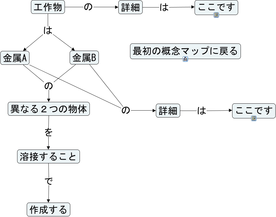 このコンセプトマップに関連する情報: 大元概念:工作物, 工作物 の 詳細, 金属B の 詳細, 工作物 は 金属B, 詳細 は ここです, 金属B の 異なる2つの物体, 工作物 は 金属A, 金属A の 異なる2つの物体, 詳細 は ここです, 溶接すること で 作成する, 異なる2つの物体 を 溶接すること, 金属A の 詳細