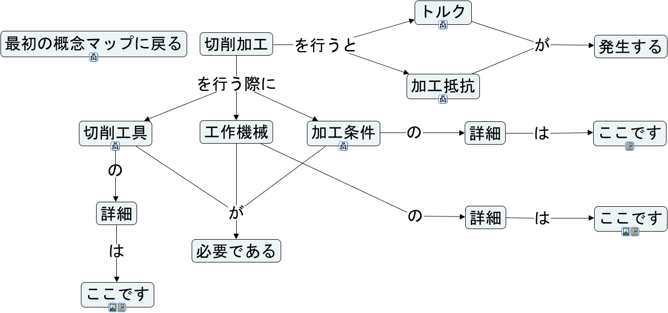 このコンセプトマップに関連する情報: 大元概念:切削加工, 加工条件 が 必要である, トルク が 発生する, 詳細 は ここです, 切削加工 を行うと トルク, 加工条件 の 詳細, 切削工具 が 必要である, 加工抵抗 が 発生する, 工作機械 の 詳細, 切削加工 を行う際に 加工条件, 工作機械 が 必要である, 切削加工 を行うと 加工抵抗, 切削工具 の 詳細, 切削加工 を行う際に 工作機械, 詳細 は ここです, 切削加工 を行う際に 切削工具, 詳細 は ここです