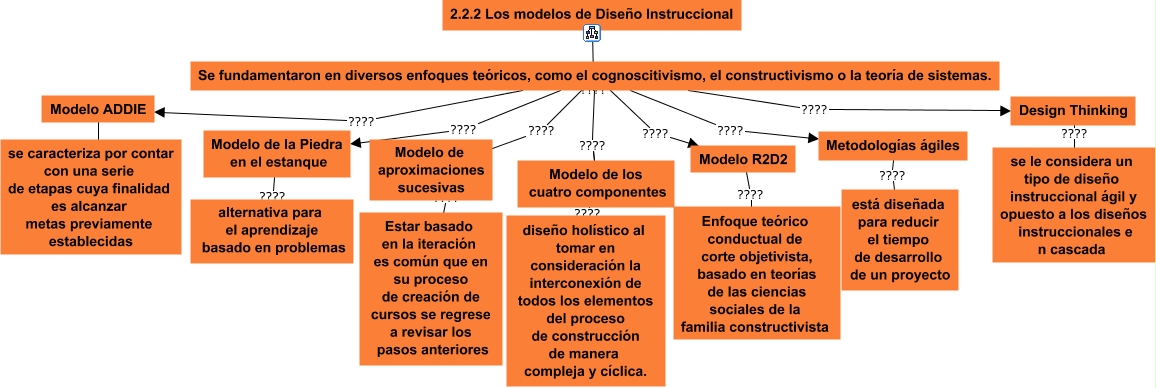 Este Cmap, tiene información relacionada con: 2.2.2 Los modelos de Diseño Instruccional, Modelo de la Piedra en el estanque ???? alternativa para el aprendizaje basado en problemas, Se fundamentaron en diversos enfoques teóricos, como el cognoscitivismo, el constructivismo o la teoría de sistemas. ???? Design Thinking, Modelo R2D2 ???? Enfoque teórico conductual de corte objetivista, basado en teorías de las ciencias sociales de la familia constructivista, Modelo de los cuatro componentes ???? diseño holístico al tomar en consideración la interconexión de todos los elementos del proceso de construcción de manera compleja y cíclica., 2.2.2 Los modelos de Diseño Instruccional ???? Se fundamentaron en diversos enfoques teóricos, como el cognoscitivismo, el constructivismo o la teoría de sistemas., Metodologías ágiles ???? está diseñada para reducir el tiempo de desarrollo de un proyecto, Se fundamentaron en diversos enfoques teóricos, como el cognoscitivismo, el constructivismo o la teoría de sistemas. ???? Modelo de la Piedra en el estanque, Se fundamentaron en diversos enfoques teóricos, como el cognoscitivismo, el constructivismo o la teoría de sistemas. ???? Modelo de aproximaciones sucesivas, Design Thinking ???? se le considera un tipo de diseño instruccional ágil y opuesto a los diseños instruccionales e n cascada, Se fundamentaron en diversos enfoques teóricos, como el cognoscitivismo, el constructivismo o la teoría de sistemas. ???? Metodologías ágiles, Modelo de aproximaciones sucesivas ???? Estar basado en la iteración es común que en su proceso de creación de cursos se regrese a revisar los pasos anteriores, Se fundamentaron en diversos enfoques teóricos, como el cognoscitivismo, el constructivismo o la teoría de sistemas. ???? Modelo R2D2, Se fundamentaron en diversos enfoques teóricos, como el cognoscitivismo, el constructivismo o la teoría de sistemas. ???? Modelo de los cuatro componentes, Se fundamentaron en diversos enfoques teóricos, como el cognoscitivismo, el constructivismo o la teoría de sistemas. ???? Modelo ADDIE, Modelo ADDIE ???? se caracteriza por contar con una serie de etapas cuya finalidad es alcanzar metas previamente establecidas